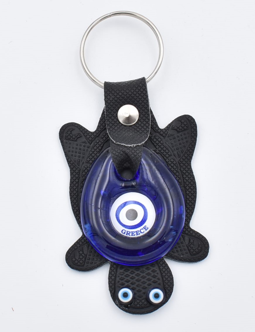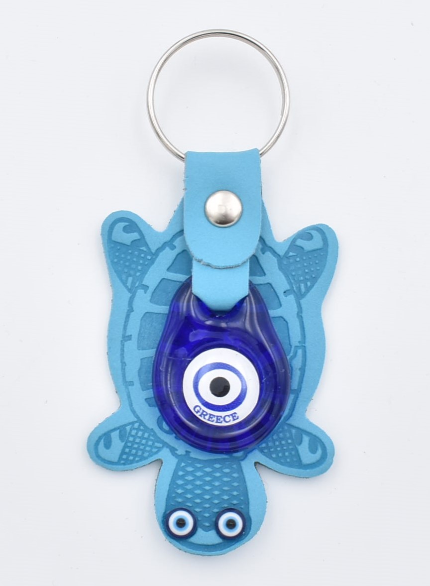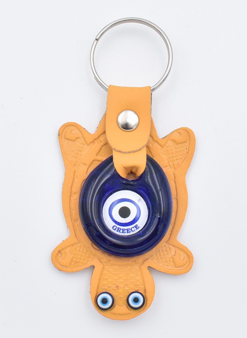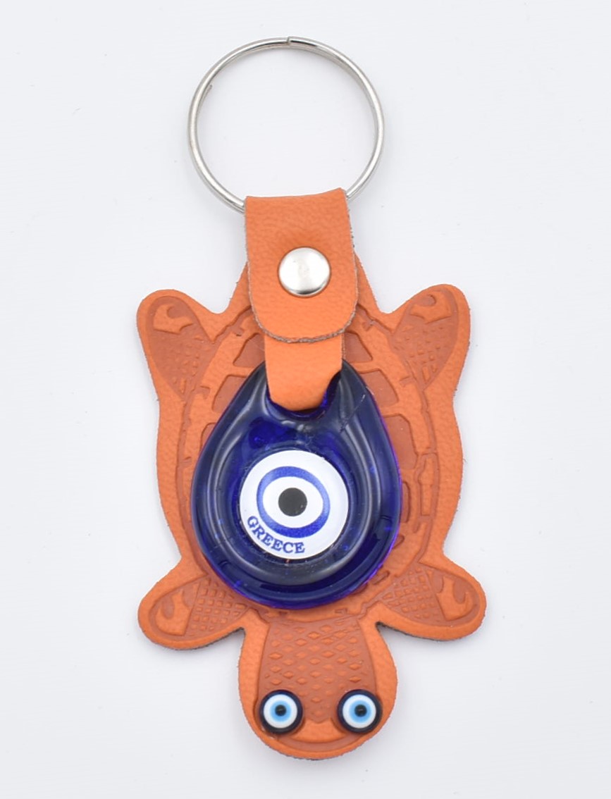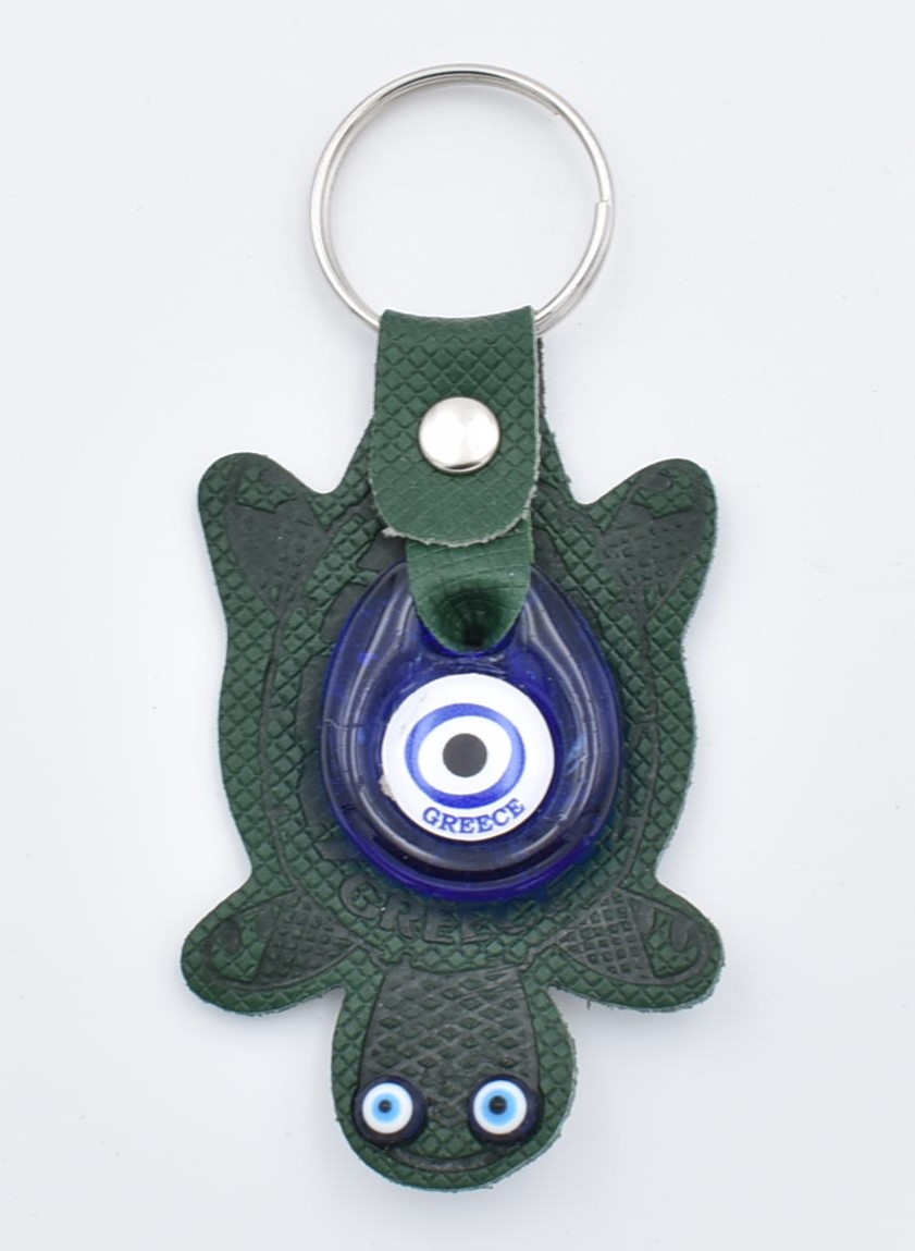 Κατασκευασμένο από ποιοτικό δέρμα σε σχήμα χελώνα , διακοσμημένο με γυάλινο ματάκι και ανάγλυφη απεικόνιση της Ακρόπολης και της λέξης “GREECE”.