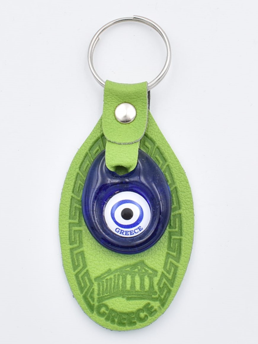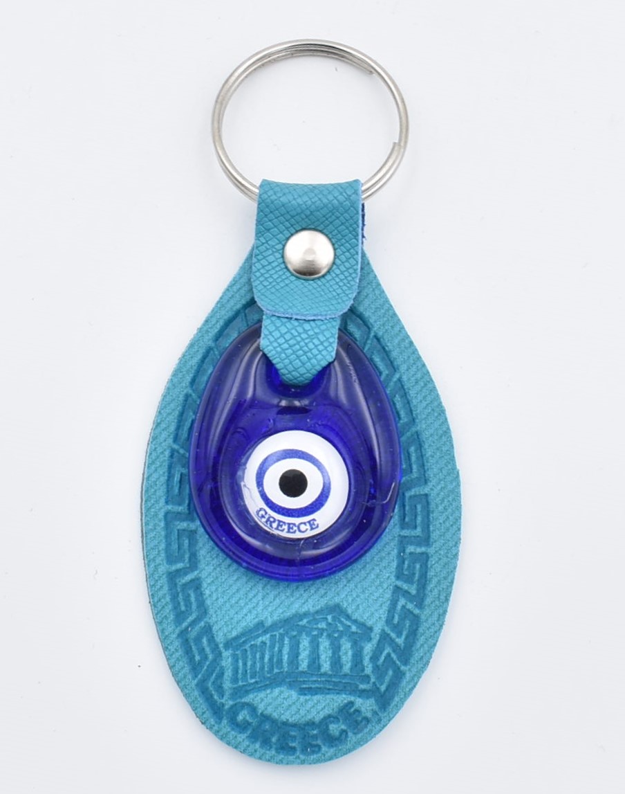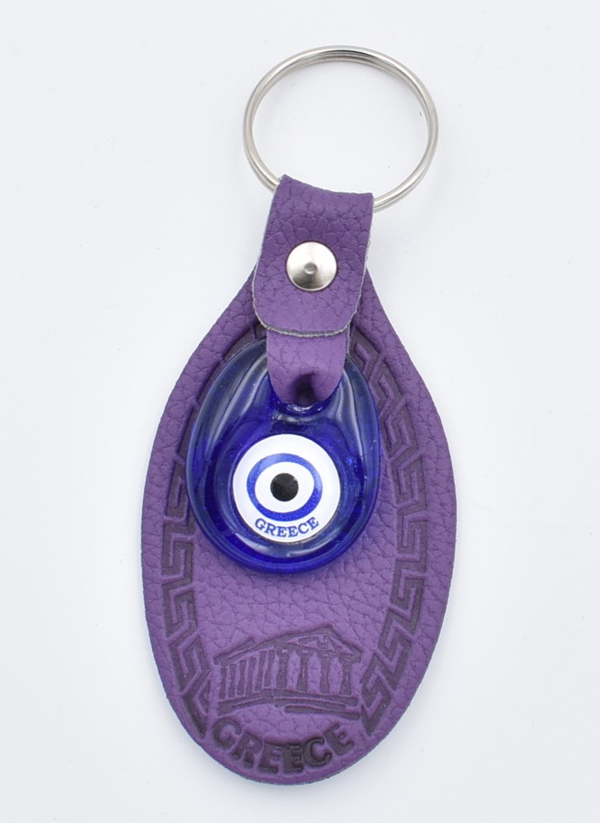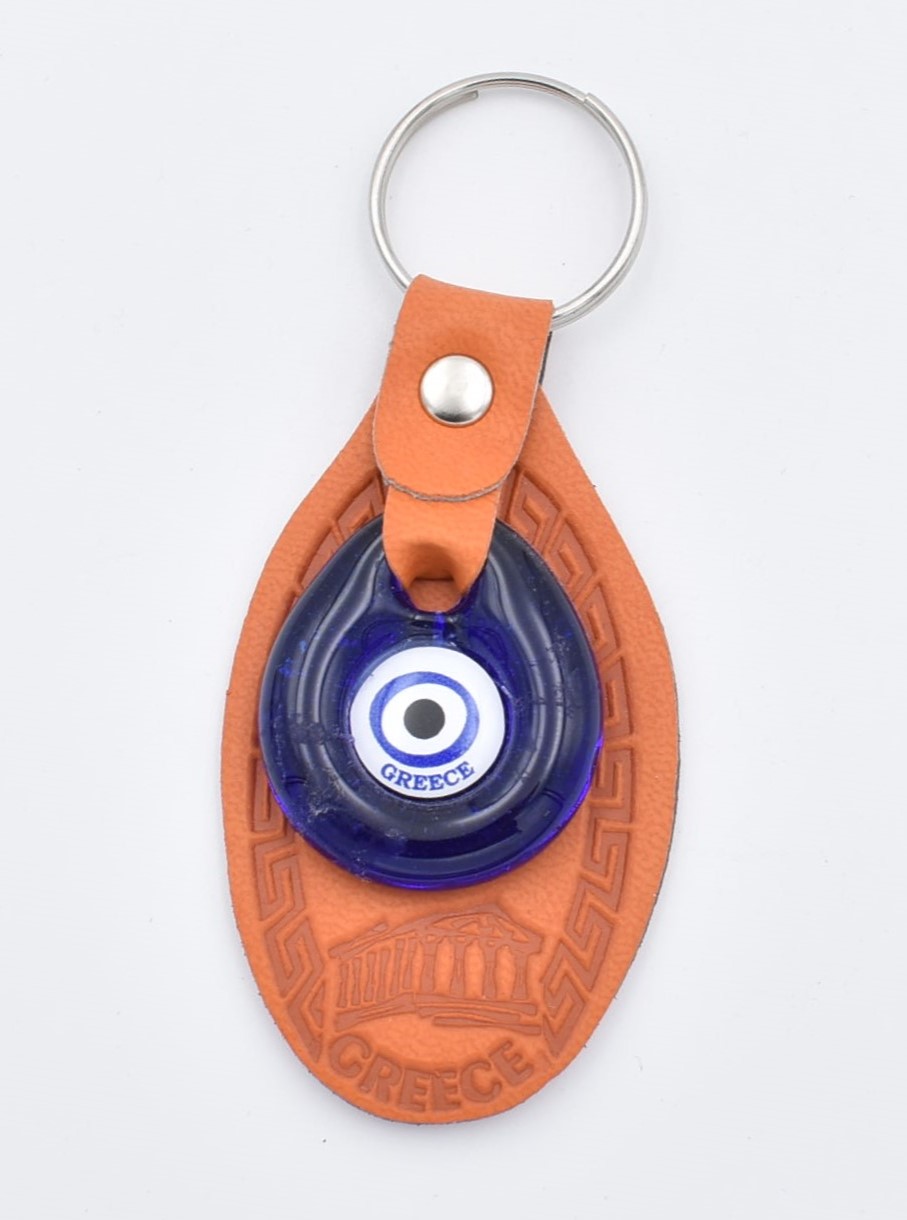 Κατασκευασμένο από ποιοτικό δέρμα σε σχήμα οβάλ με μαίανδρο, διακοσμημένο με γυάλινο ματάκι και ανάγλυφη απεικόνιση της Ακρόπολης και της λέξης “GREECE”.
