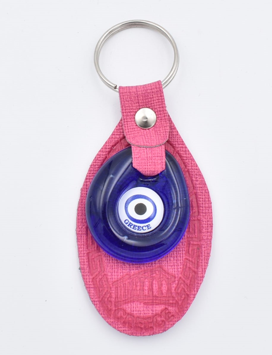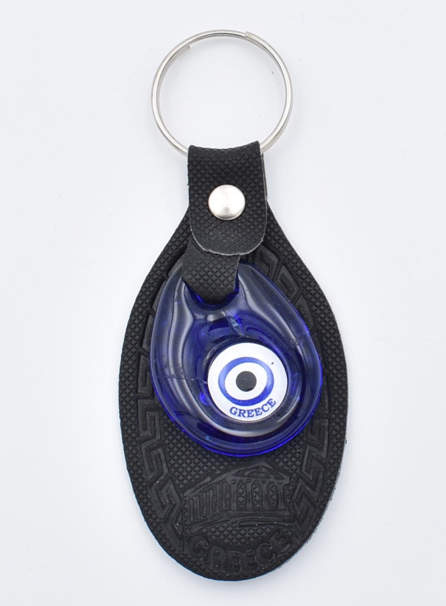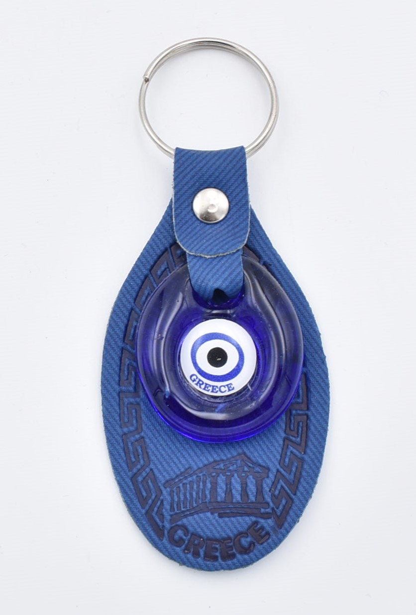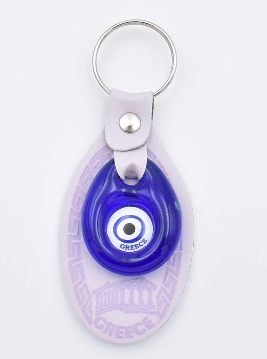 Κατασκευασμένο από ποιοτικό δέρμα σε σχήμα οβάλ με μαίανδρο, διακοσμημένο με γυάλινο ματάκι και ανάγλυφη απεικόνιση της Ακρόπολης και της λέξης “GREECE”.