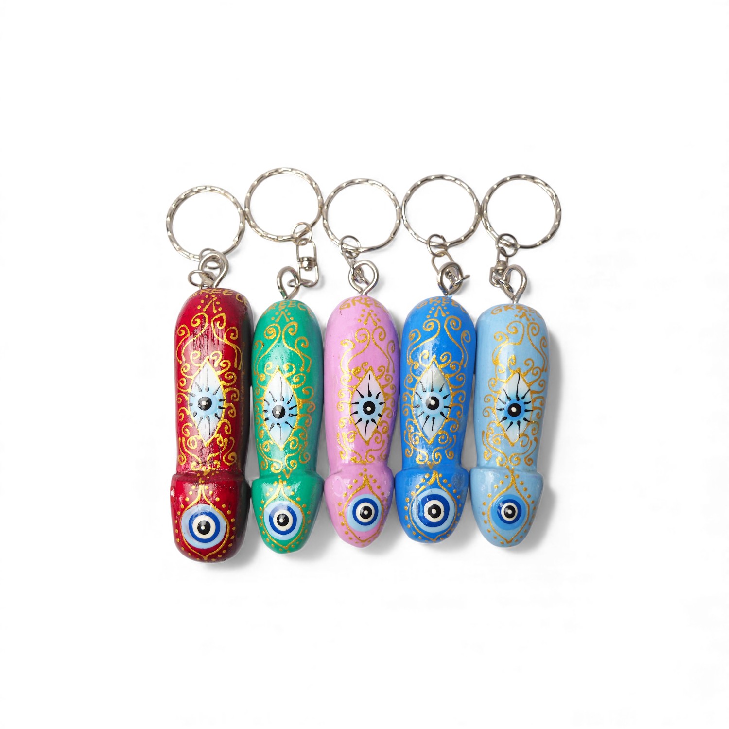 Χειροποίητο ξύλινο μπρελόκ σε σχήμα φαλλού, σε έντονα χρώματα με σχέδιο μάτι και με επιγραφή “GREECE”.