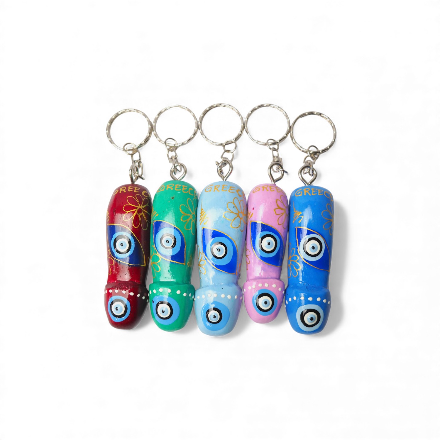 Χειροποίητο ξύλινο μπρελόκ σε σχήμα φαλλού, σε έντονα χρώματα με σχέδιο μάτι και με επιγραφή “GREECE”.