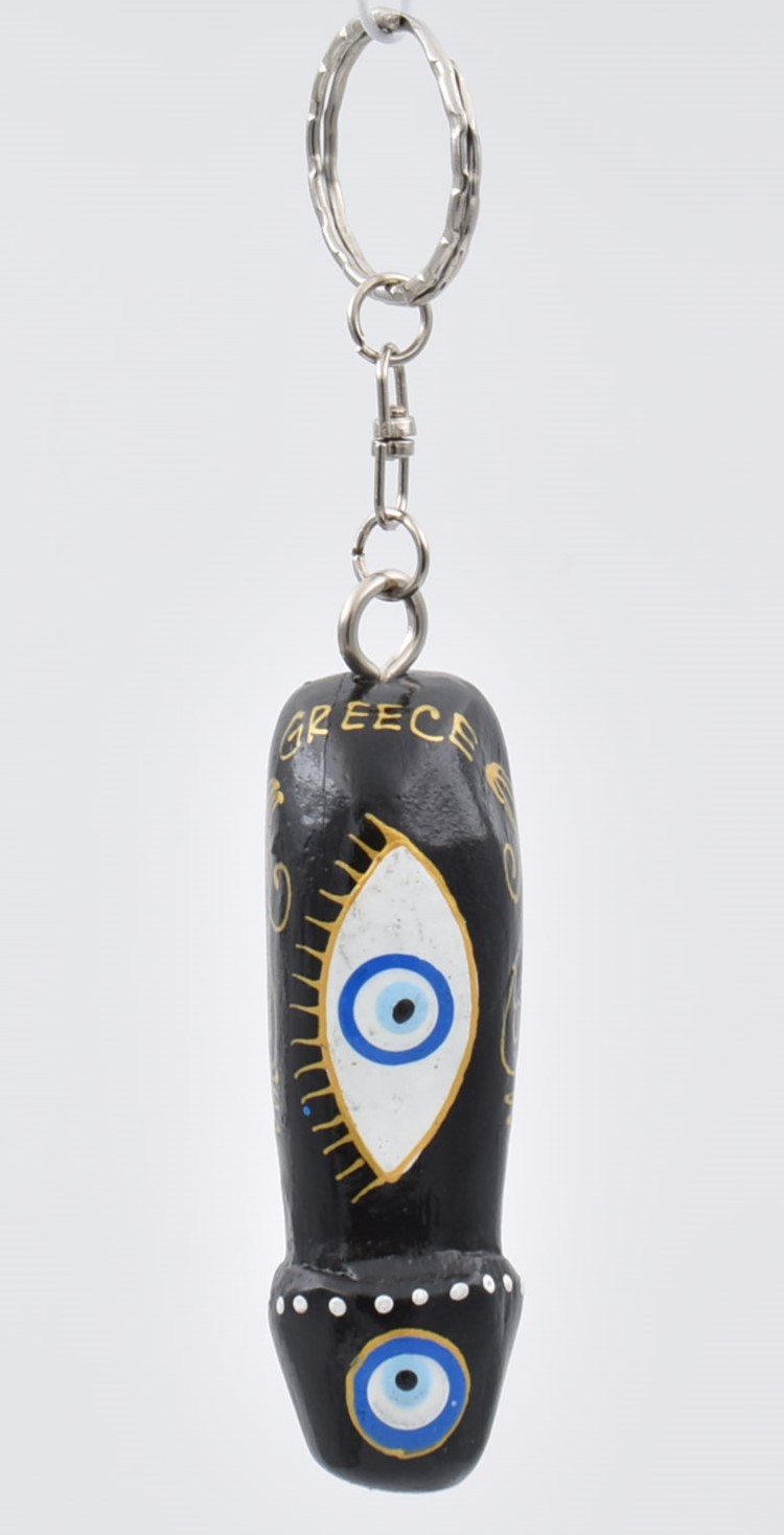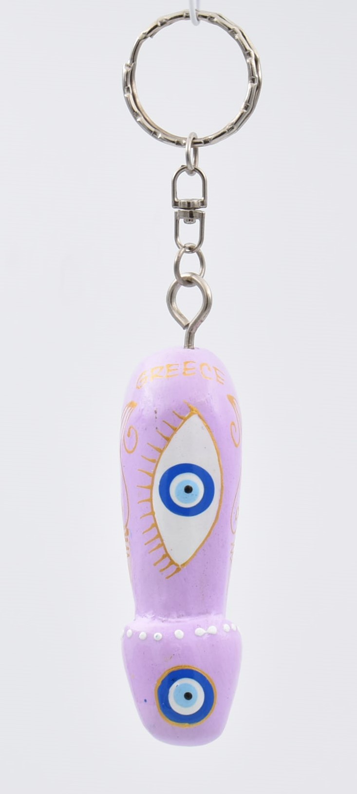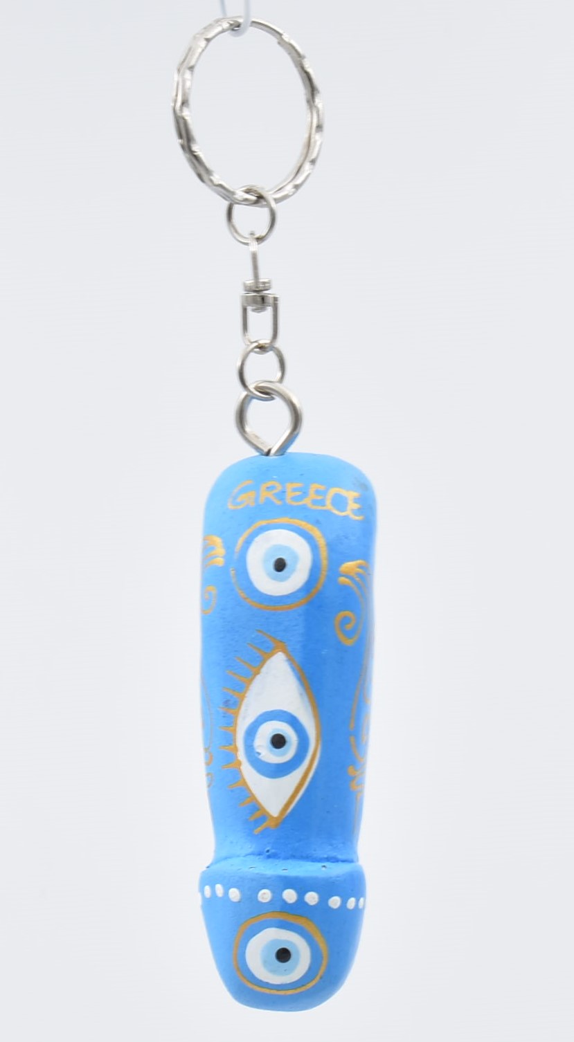 Χειροποίητο ξύλινο μπρελόκ σε σχήμα φαλλού, σε έντονα χρώματα με σχέδιο μάτι και με επιγραφή “GREECE”.