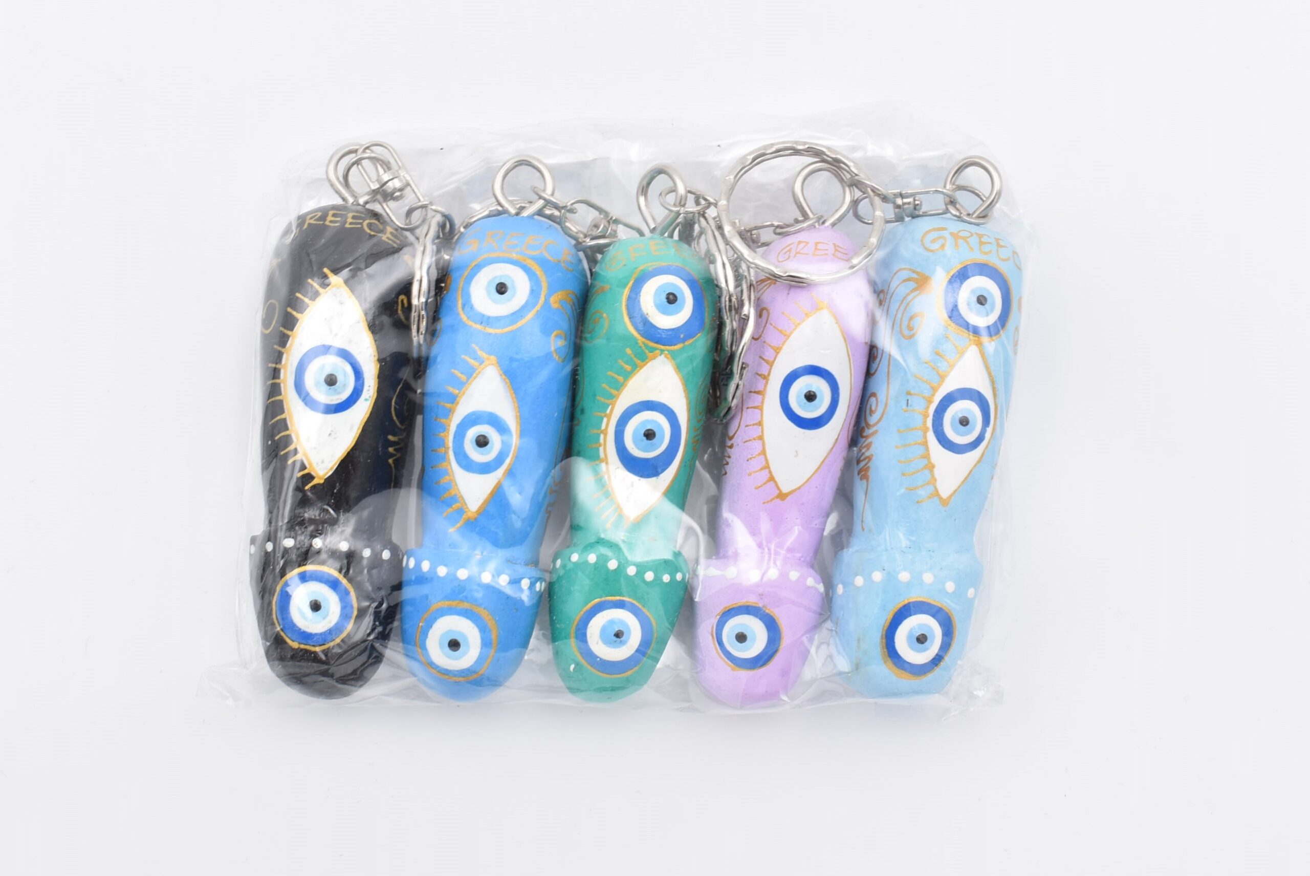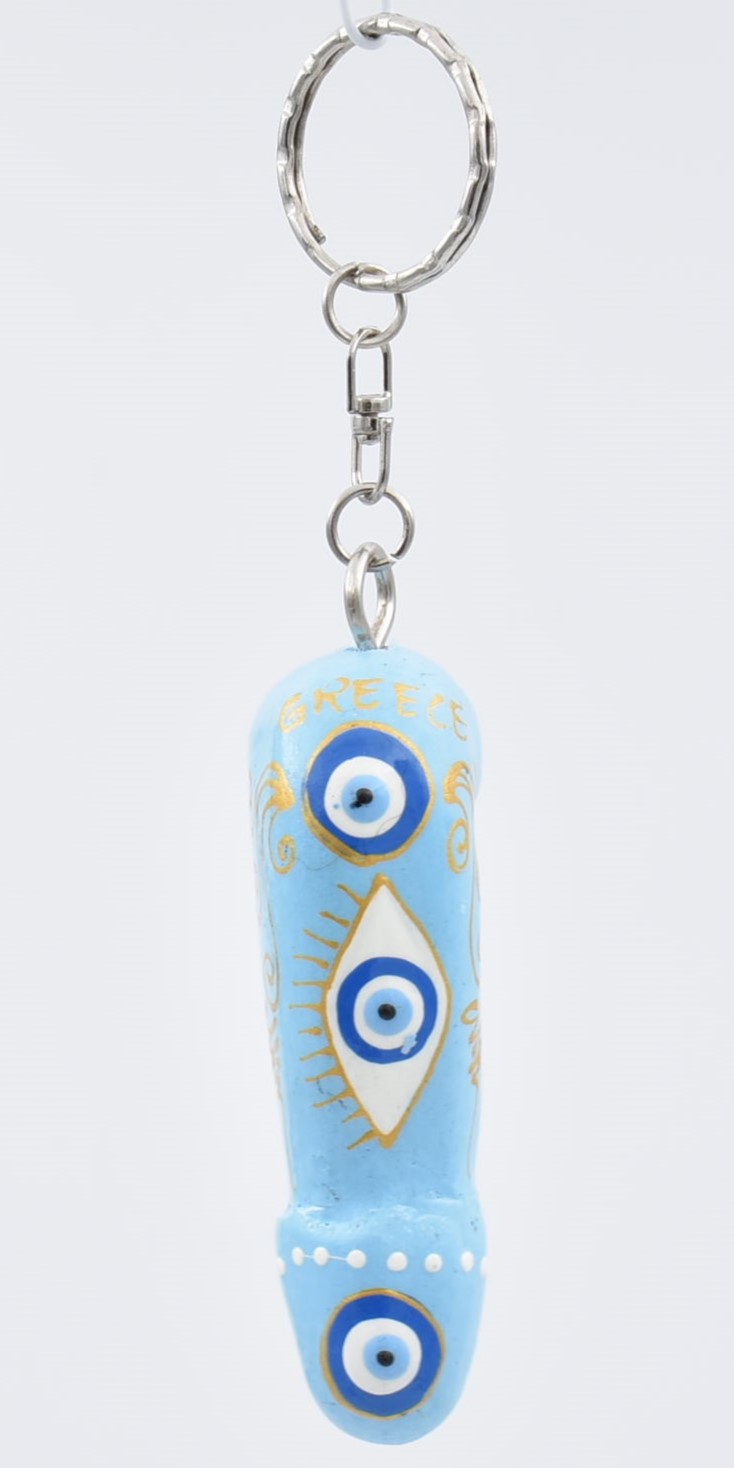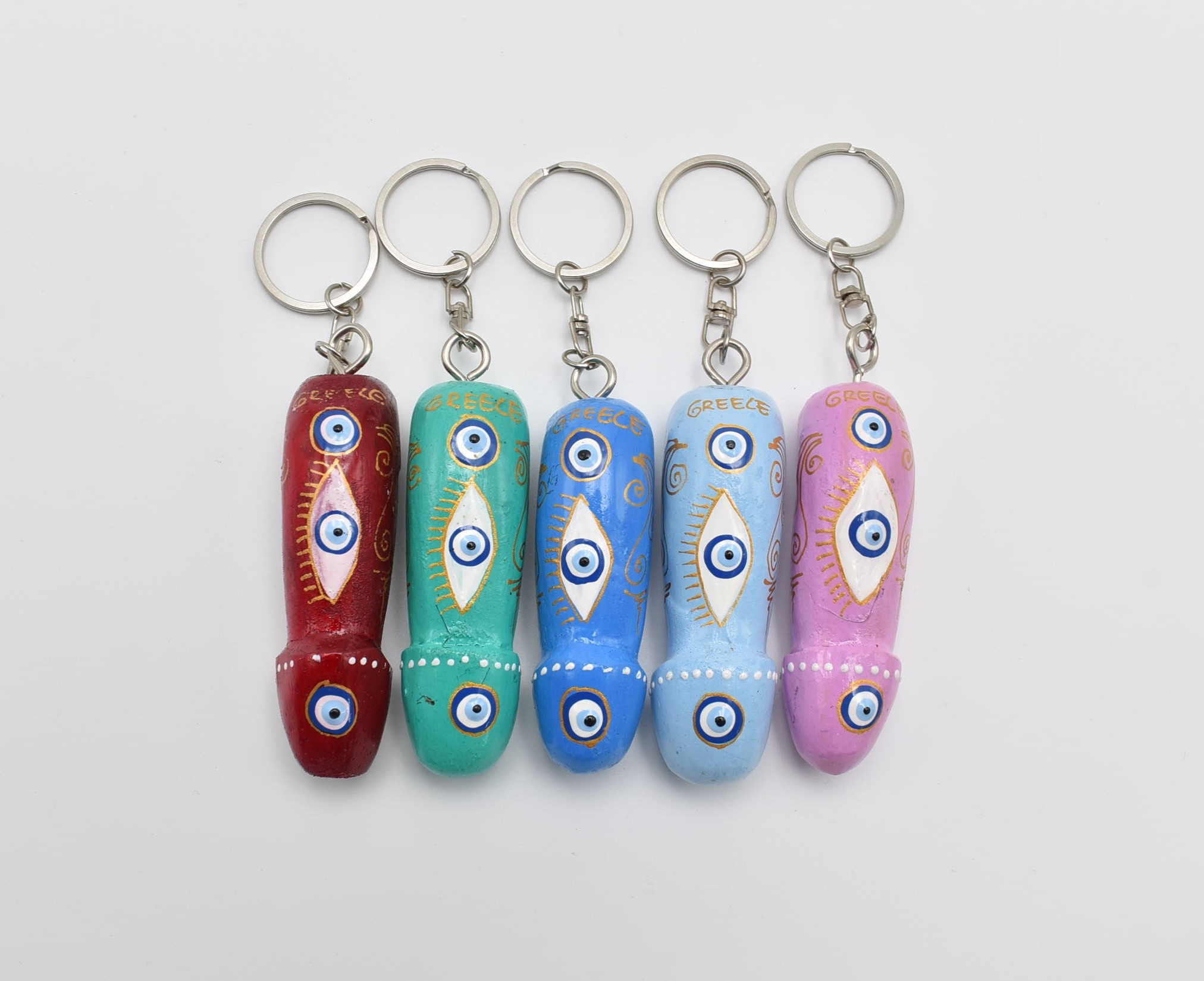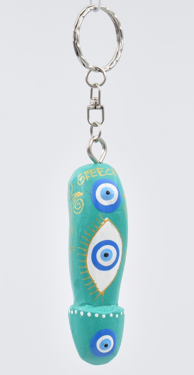 Χειροποίητο ξύλινο μπρελόκ σε σχήμα φαλλού, σε έντονα χρώματα με σχέδιο μάτι και με επιγραφή “GREECE”.