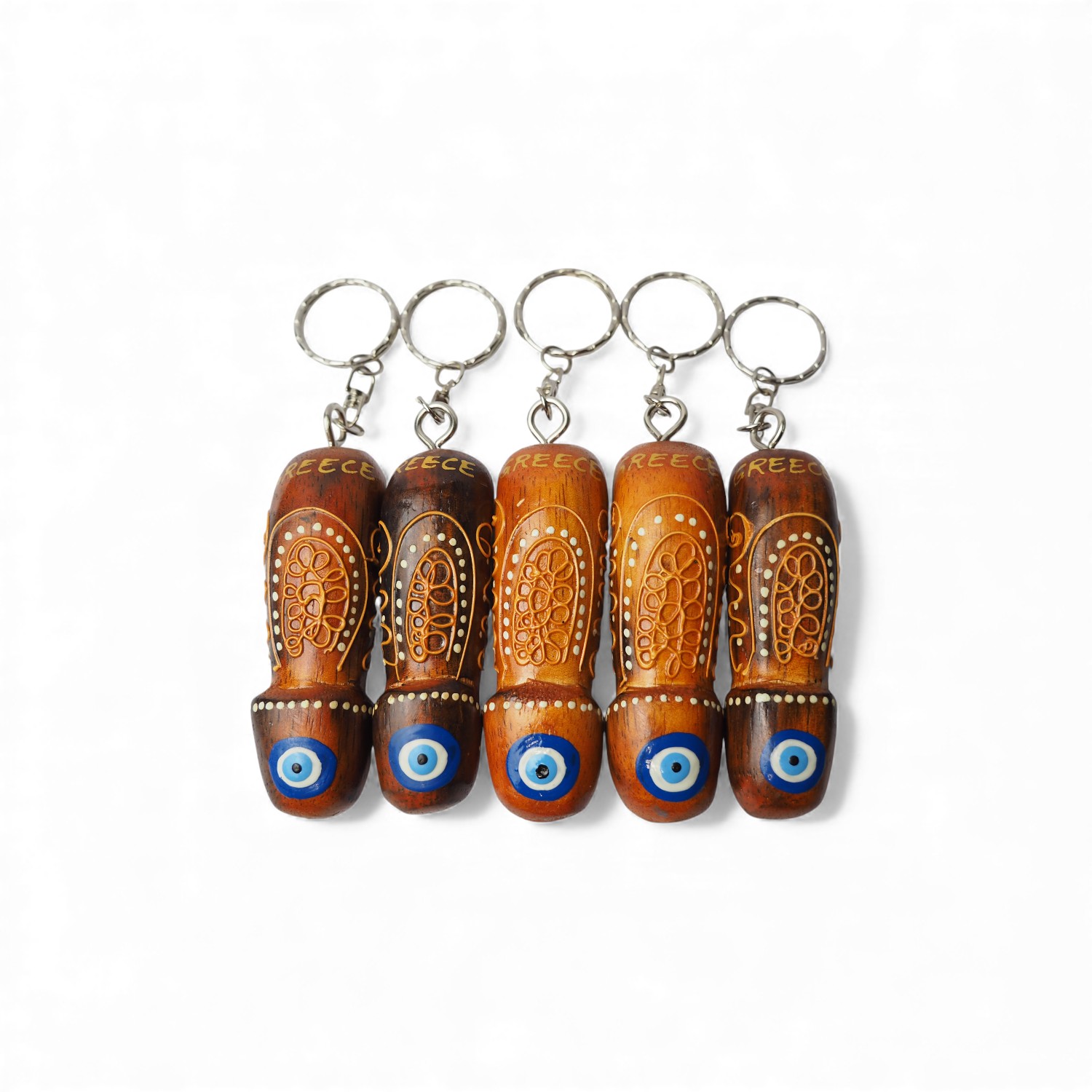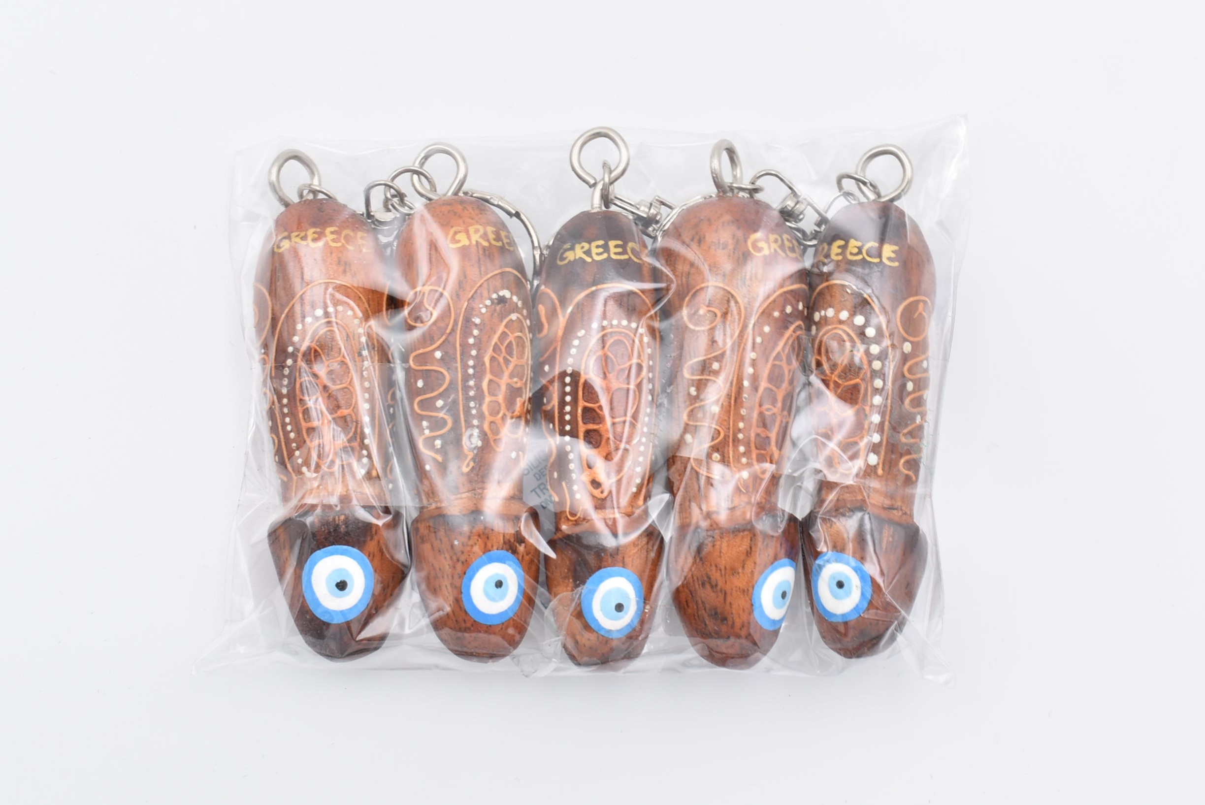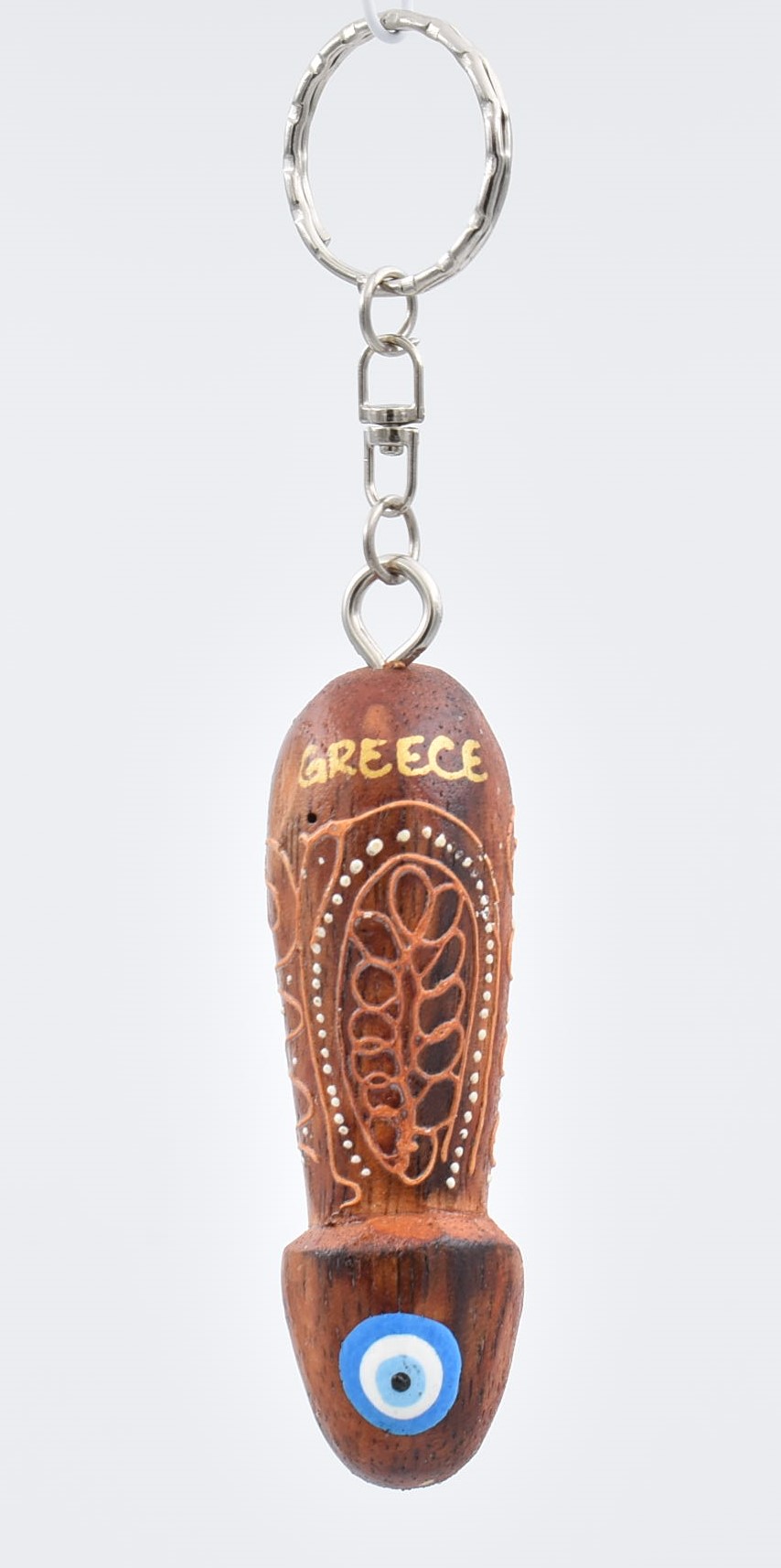 Χειροποίητο ξύλινο μπρελόκ σε σχήμα φαλλού, φυσικό καφέ με ζωγραφιστές λεπτομέρειες , με ενσωματωμένο γαλάζιο “μάτι” στο κάτω μέρος και με επιγραφή “GREECE”.