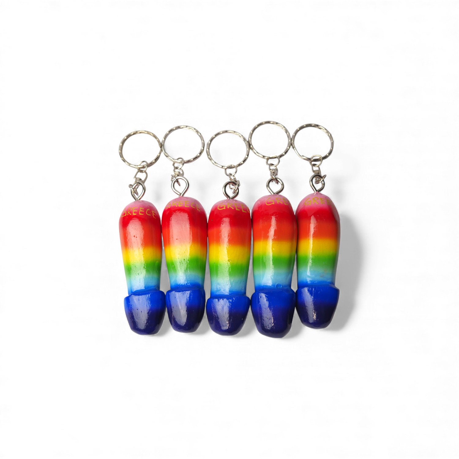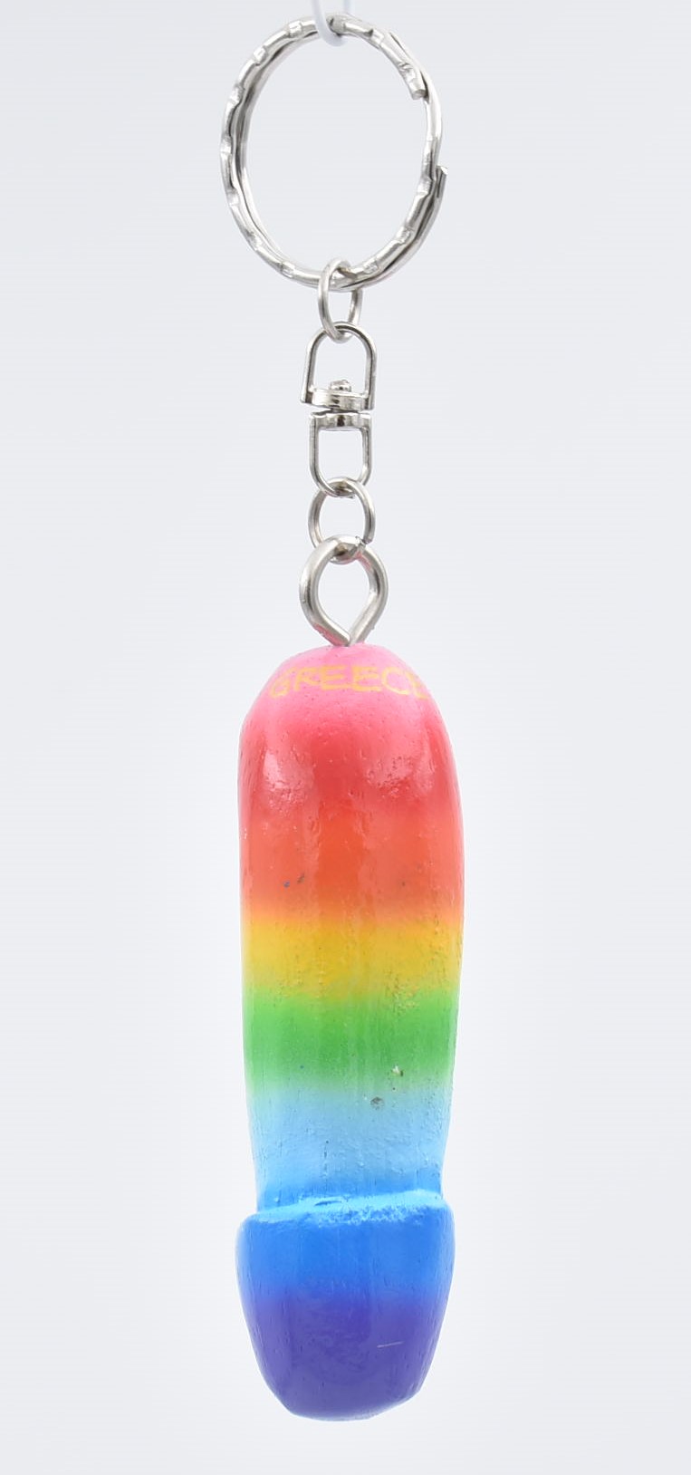 Χειροποίητο ξύλινο μπρελόκ σε σχήμα φαλλού, σε έντονα χρώματα του ουράνιου τόξου και με επιγραφή “GREECE”.