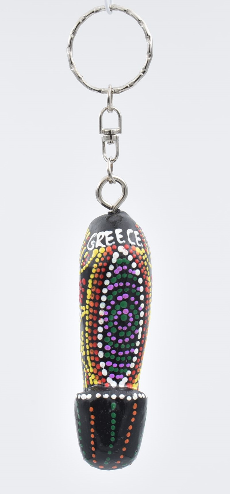 Χειροποίητο ξύλινο μπρελόκ σε σχήμα φαλλού, σε μαύρο χρώμα με ζωγραφιστές λεπτομέρειες και με επιγραφή “GREECE”.