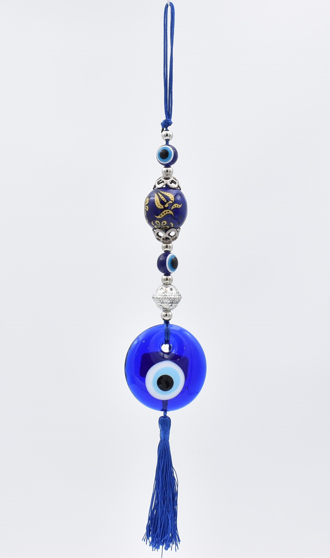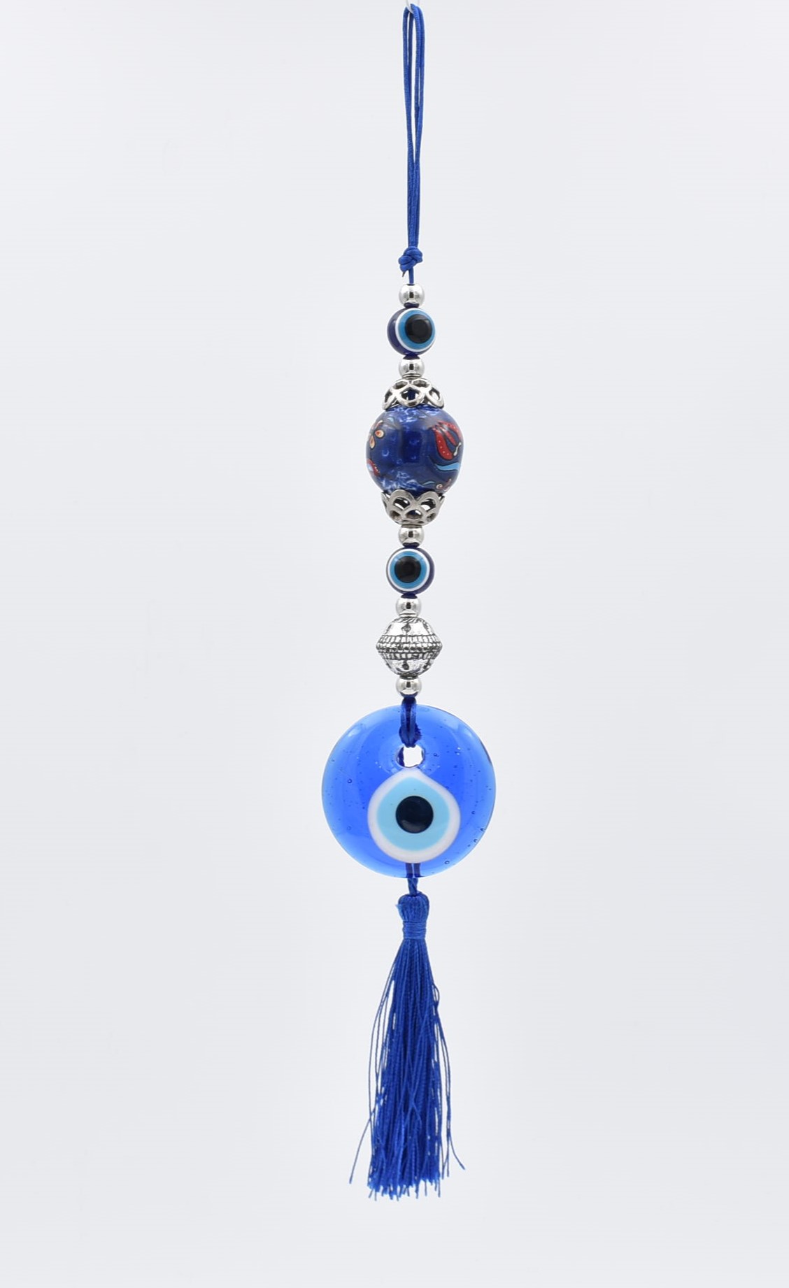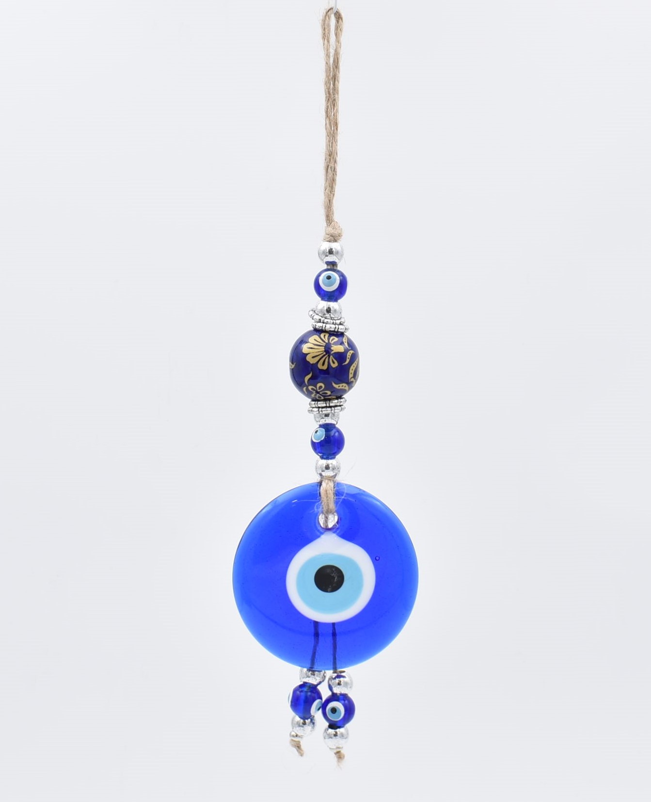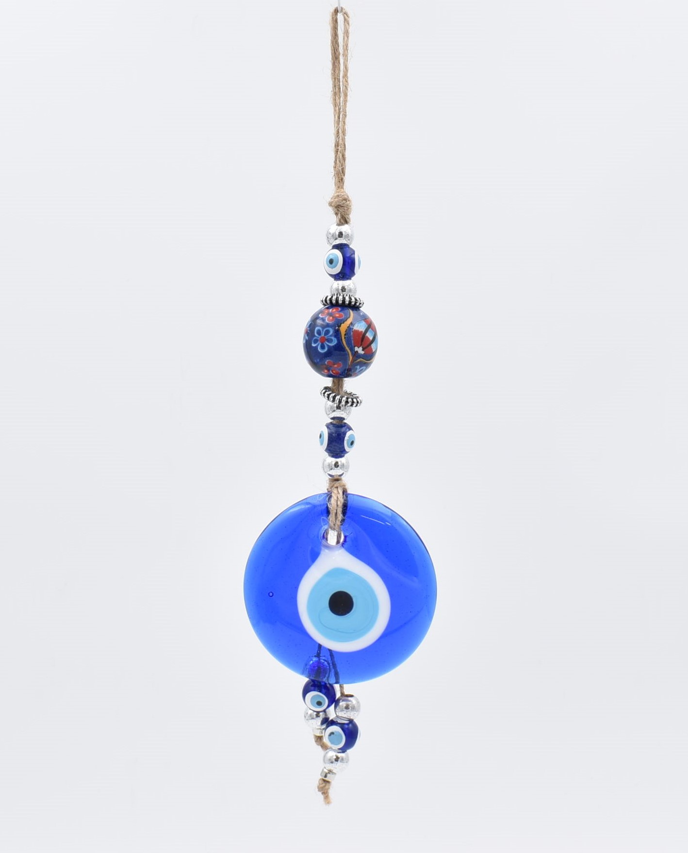 Κρεμαστό γούρι με μπλε γυάλινο μάτι διαμέτρου 5 εκ – 7 εκ. και κεραμική μπλε μπίλια με σχέδιο. Διακοσμείται με χάντρες και μεταλλικά στοιχεία. Κρεμιέται από σκοινί.