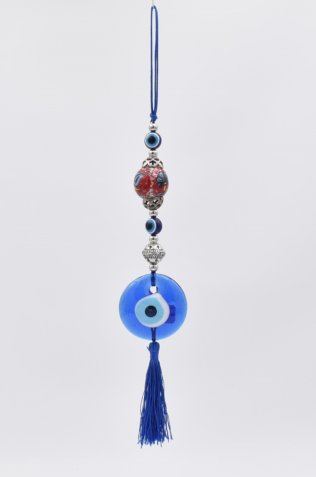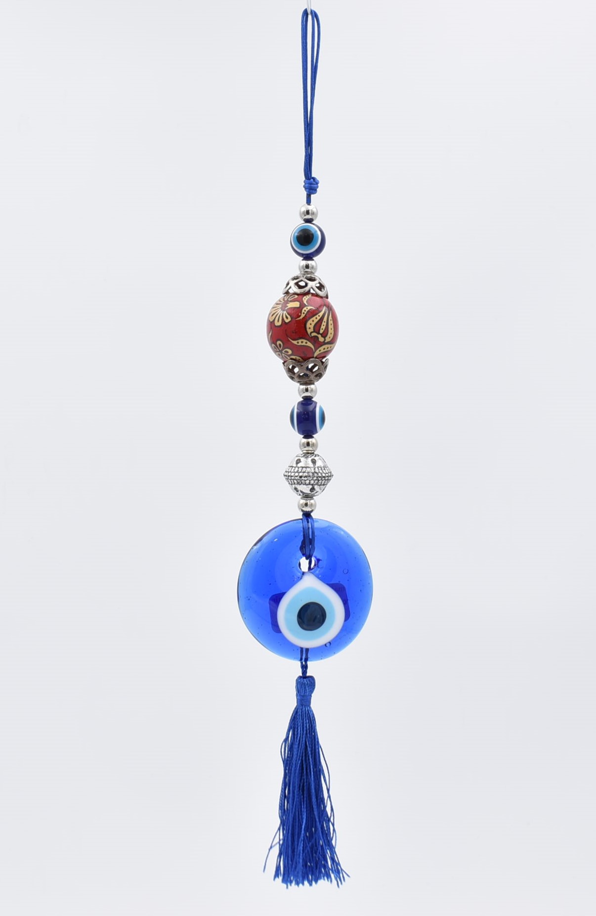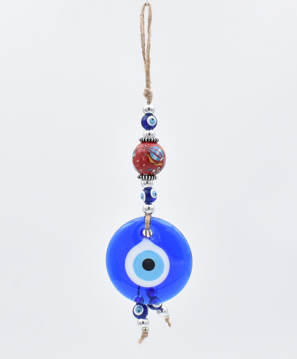 Κρεμαστό γούρι με μπλε γυάλινο μάτι διαμέτρου 5 εκ – 7 εκ. και κεραμική κόκκινη μπίλια με σχέδιο. Διακοσμείται με χάντρες και μεταλλικά στοιχεία. Κρεμιέται από σκοινί.