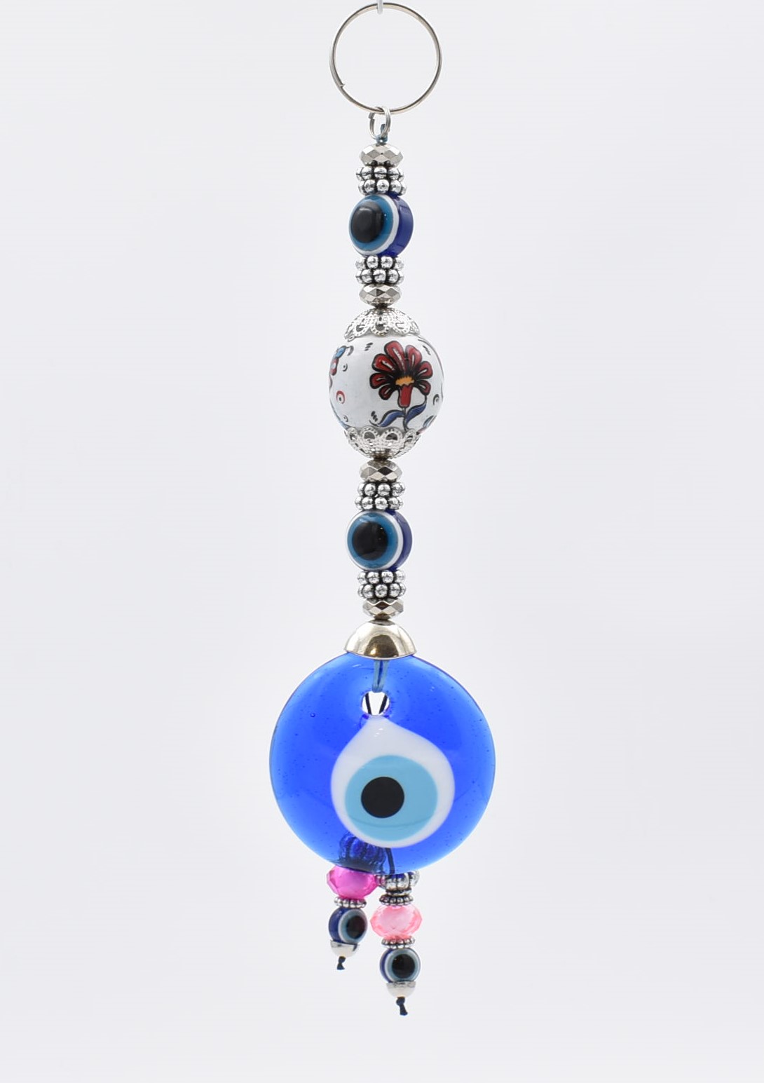Κρεμαστό γούρι με μπλε γυάλινο μάτι διαμέτρου 5 εκ. και κεραμική λευκή μπίλια με σχέδιο. Διακοσμείται με χάντρες και μεταλλικά στοιχεία. Κρεμιέται από σιδερένιο κρίκο.