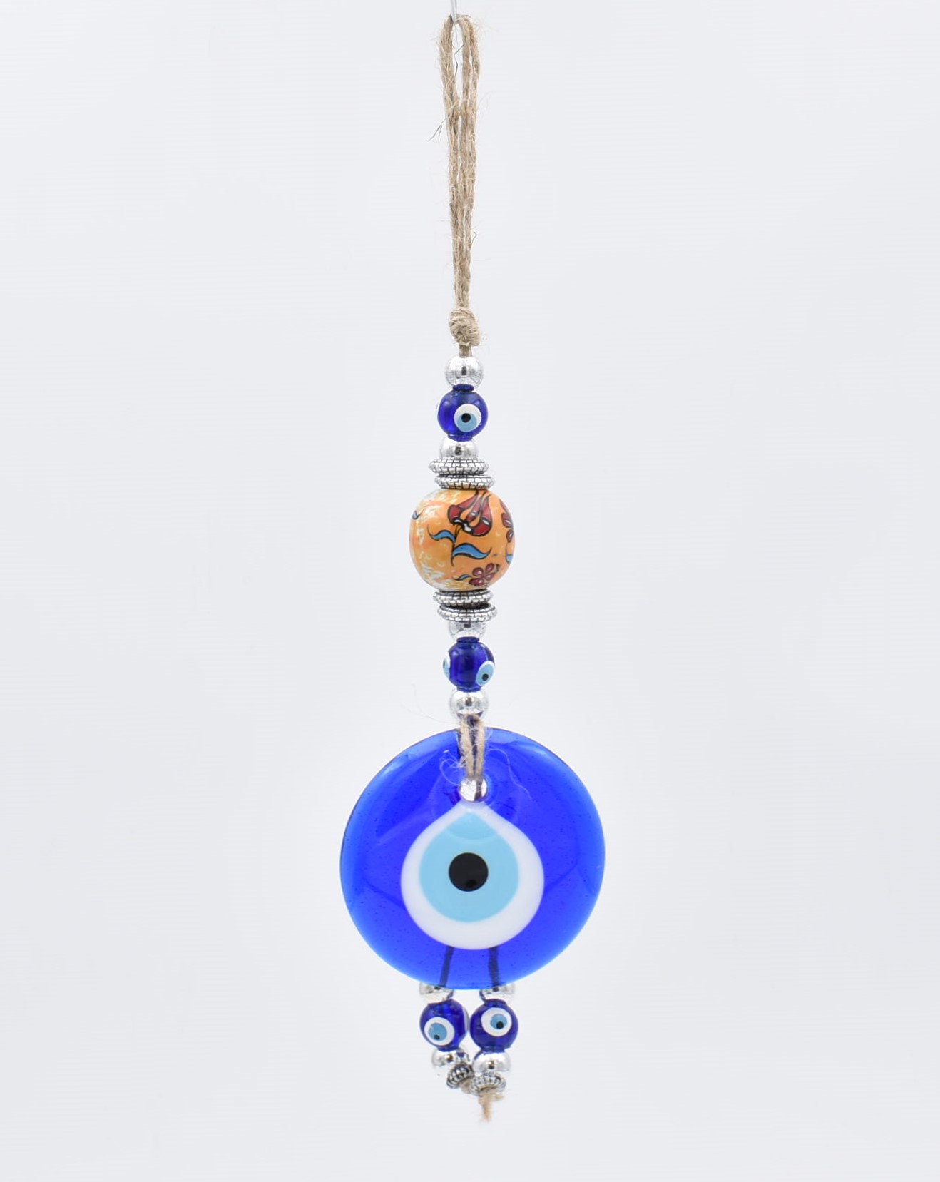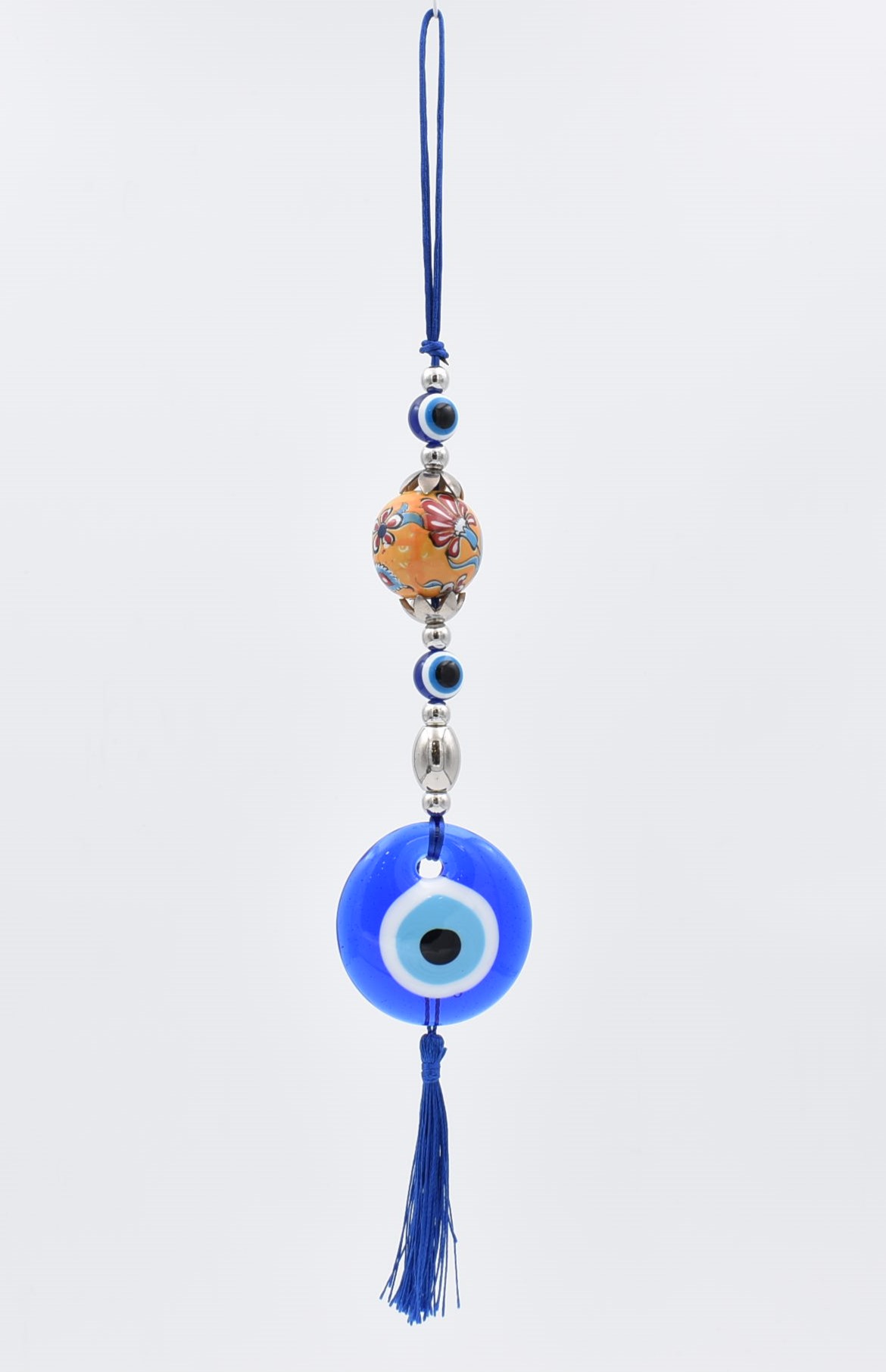 Κρεμαστό γούρι με μπλε γυάλινο μάτι διαμέτρου 5 εκ – 7 εκ. και κεραμική πορτοκαλί μπίλια με σχέδιο. Διακοσμείται με χάντρες και μεταλλικά στοιχεία. Κρεμιέται από σκοινί.