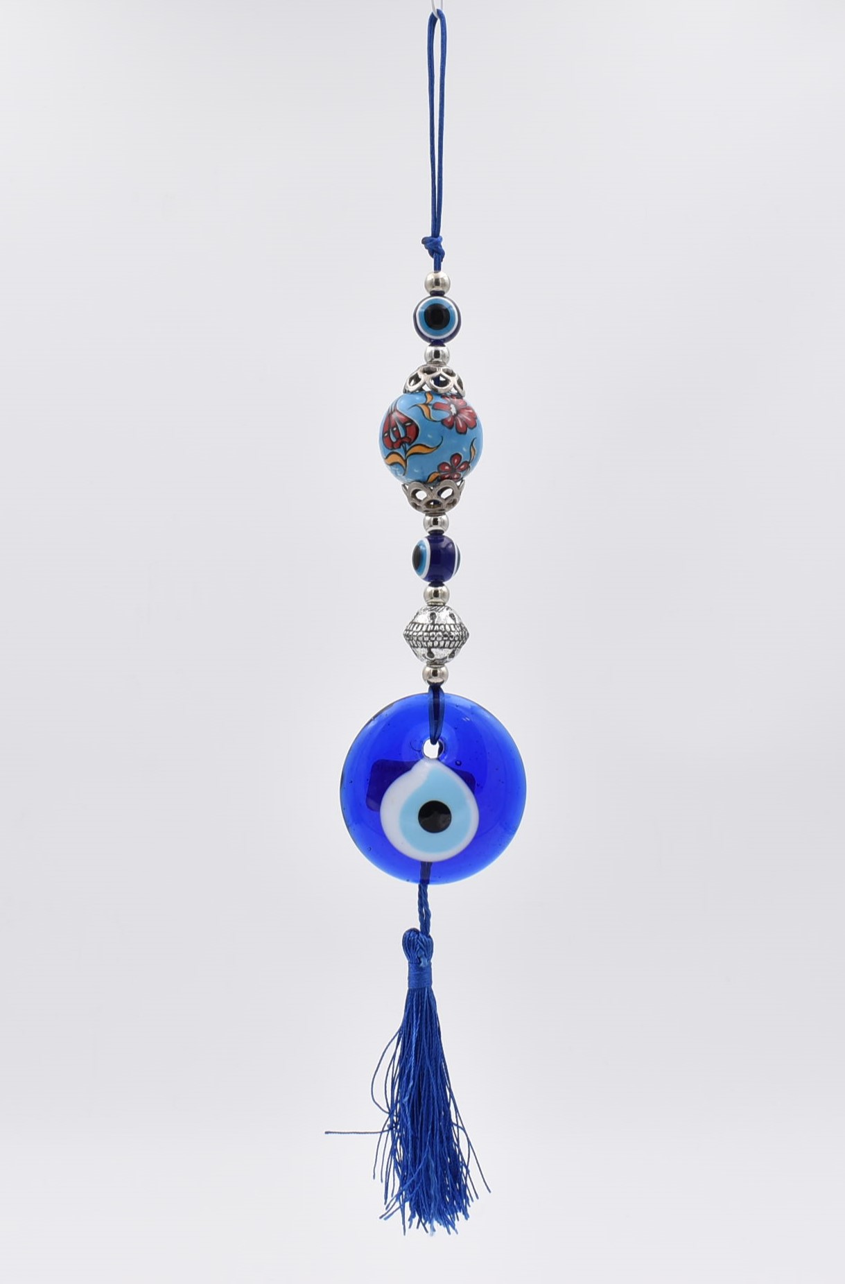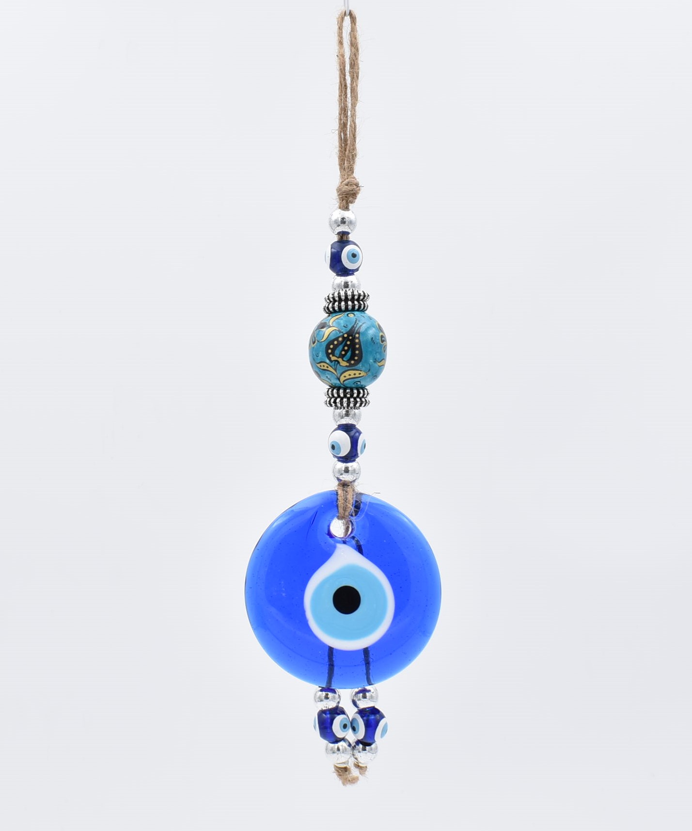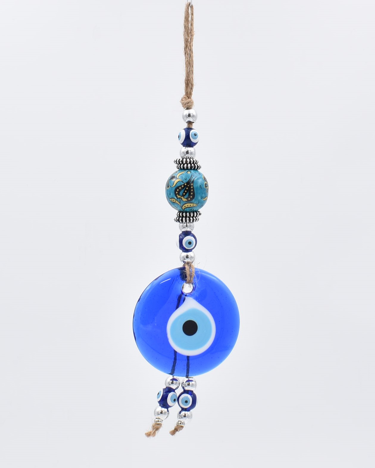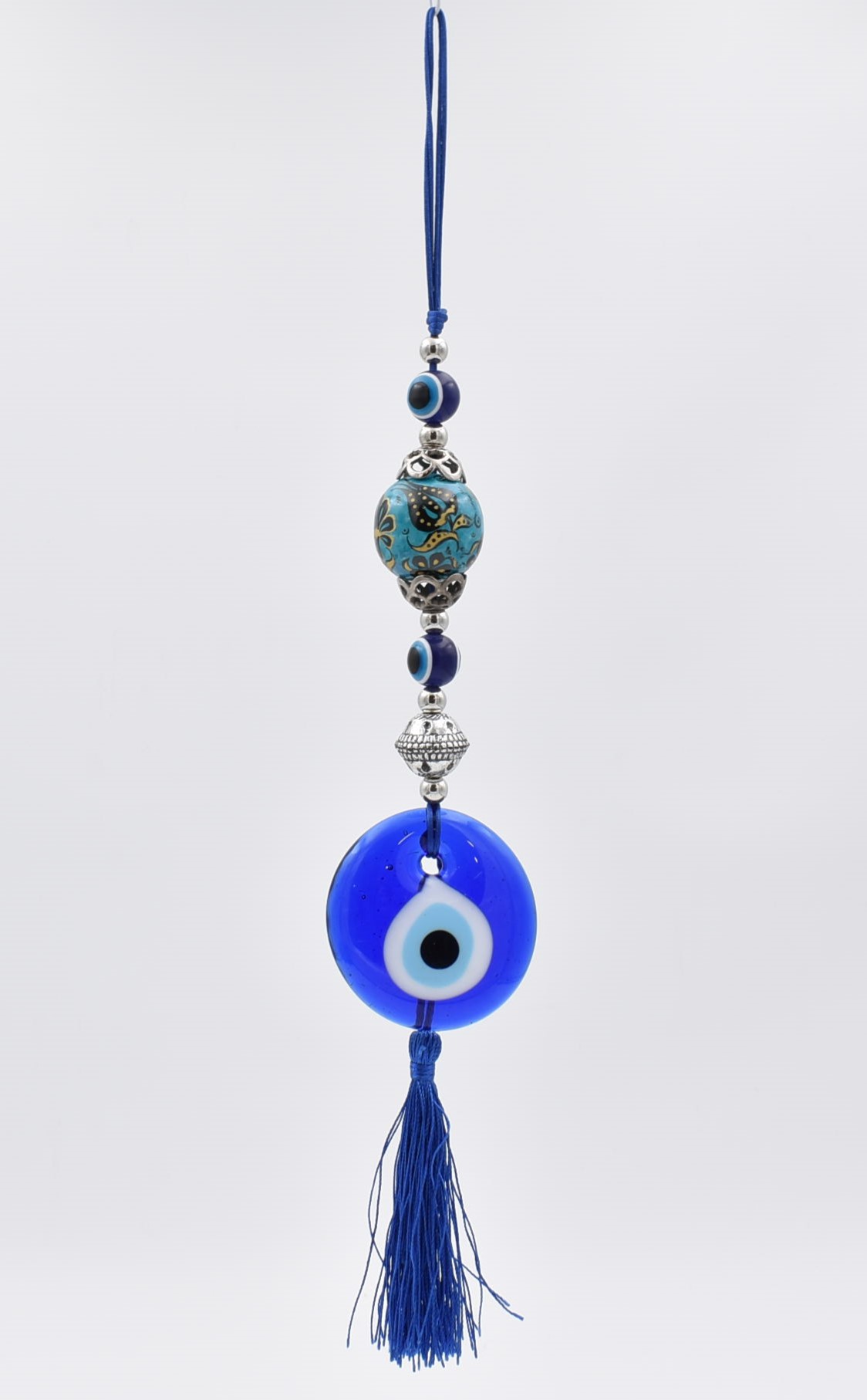 Κρεμαστό γούρι με μπλε γυάλινο μάτι διαμέτρου 5 εκ – 7 εκ. και κεραμική θαλασσί – πετρόλ μπίλια με σχέδιο. Διακοσμείται με χάντρες και μεταλλικά στοιχεία. Κρεμιέται από σκοινί.