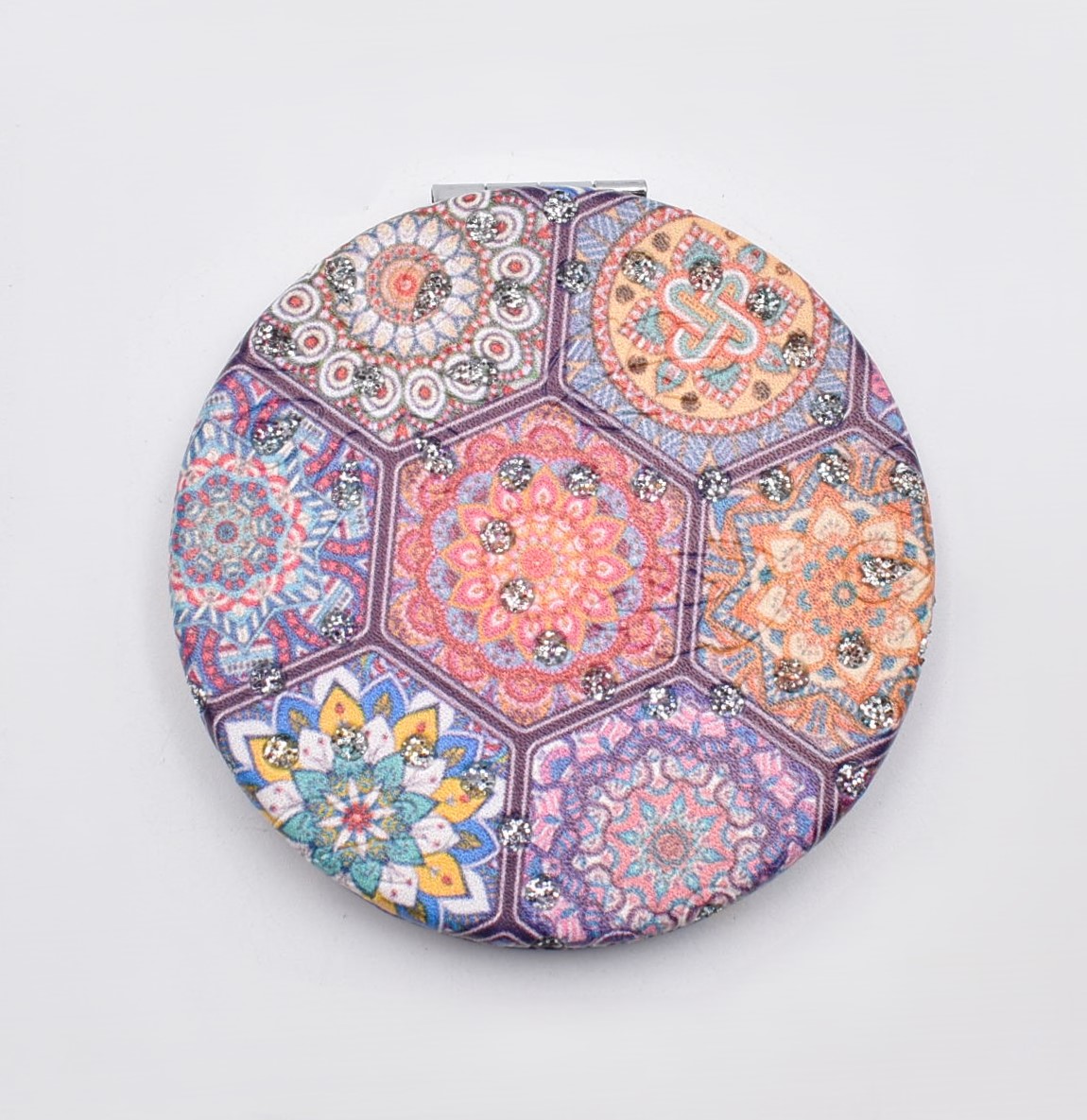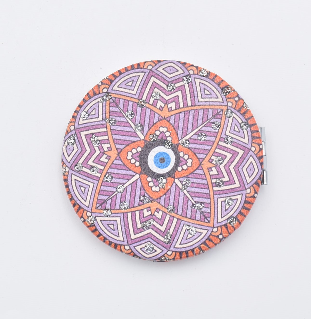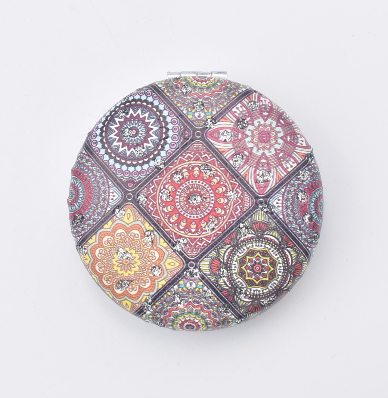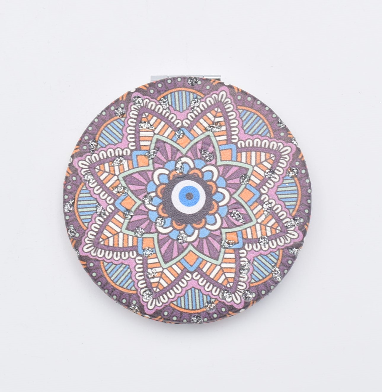Κομψό στρογγυλό καθρεπτάκι τσέπης με μοντέρνο σχέδιο “μάνταλα” σε διάφορες αποχρώσεις.