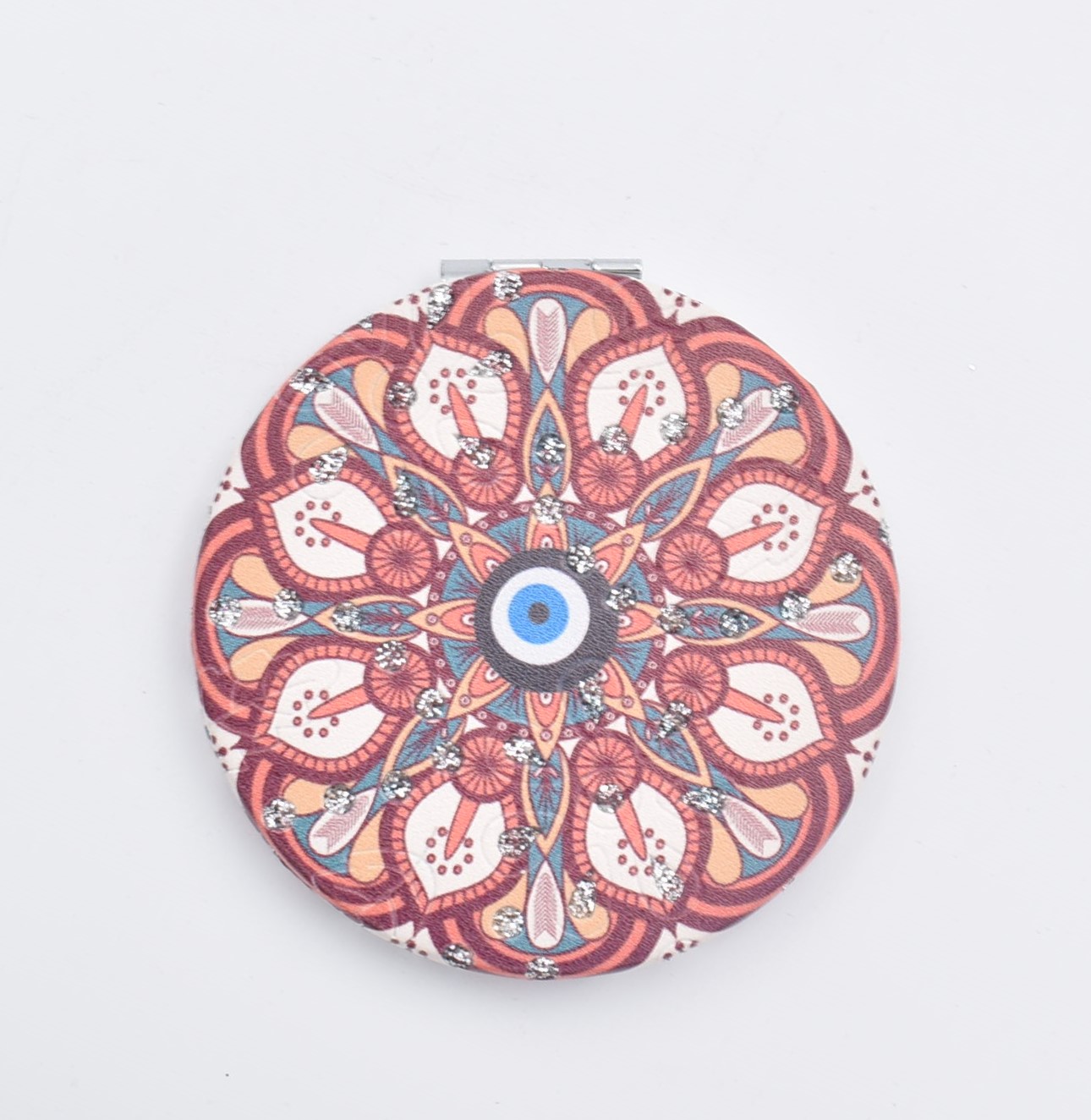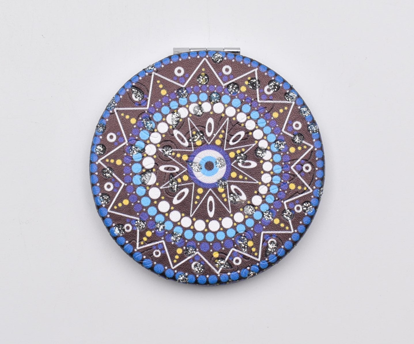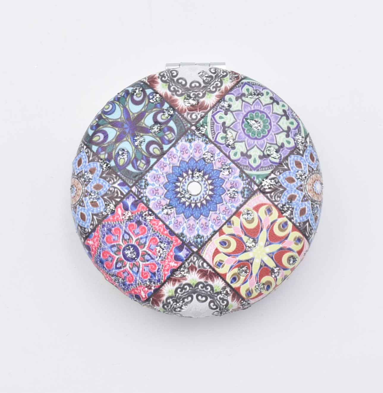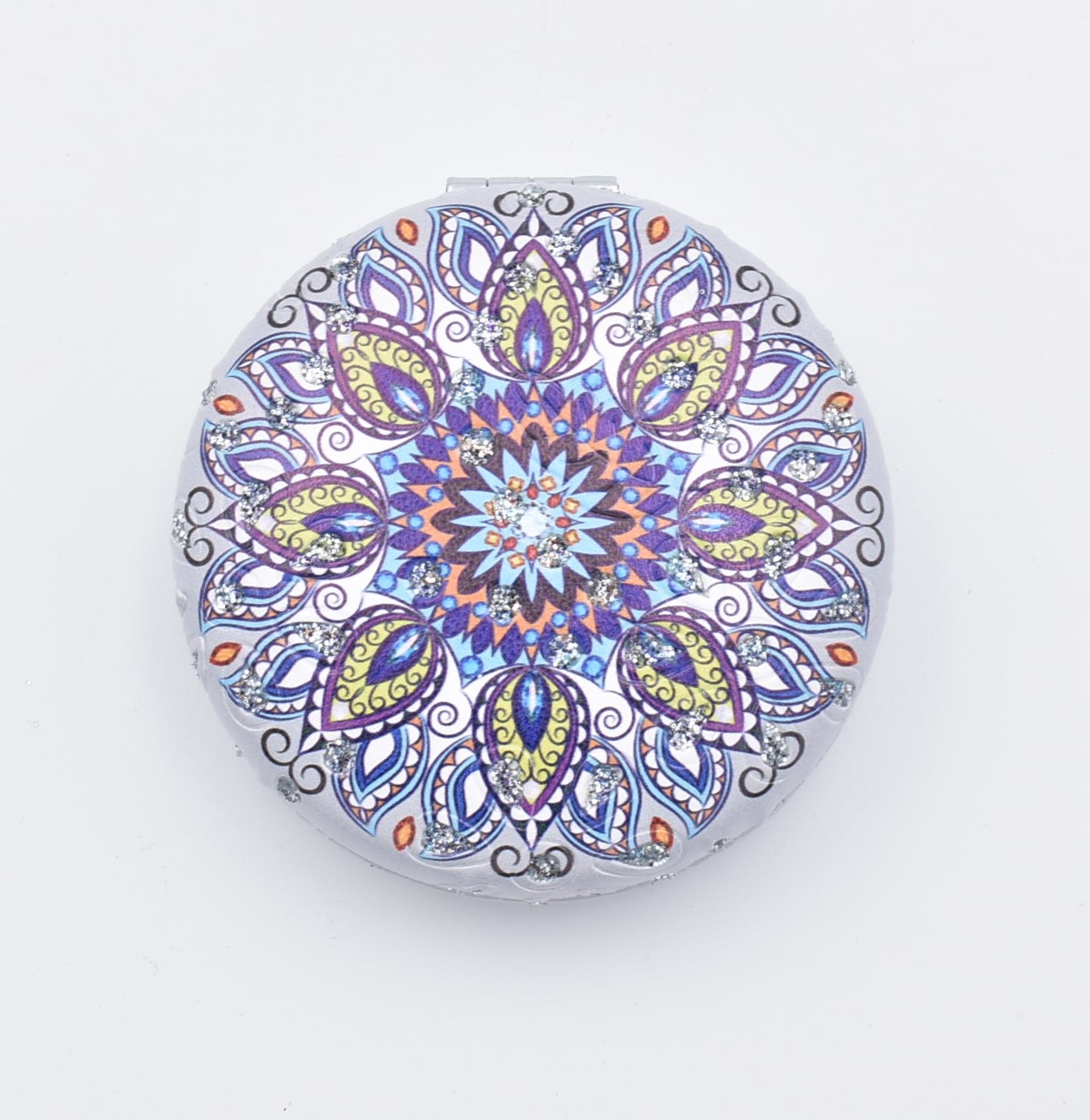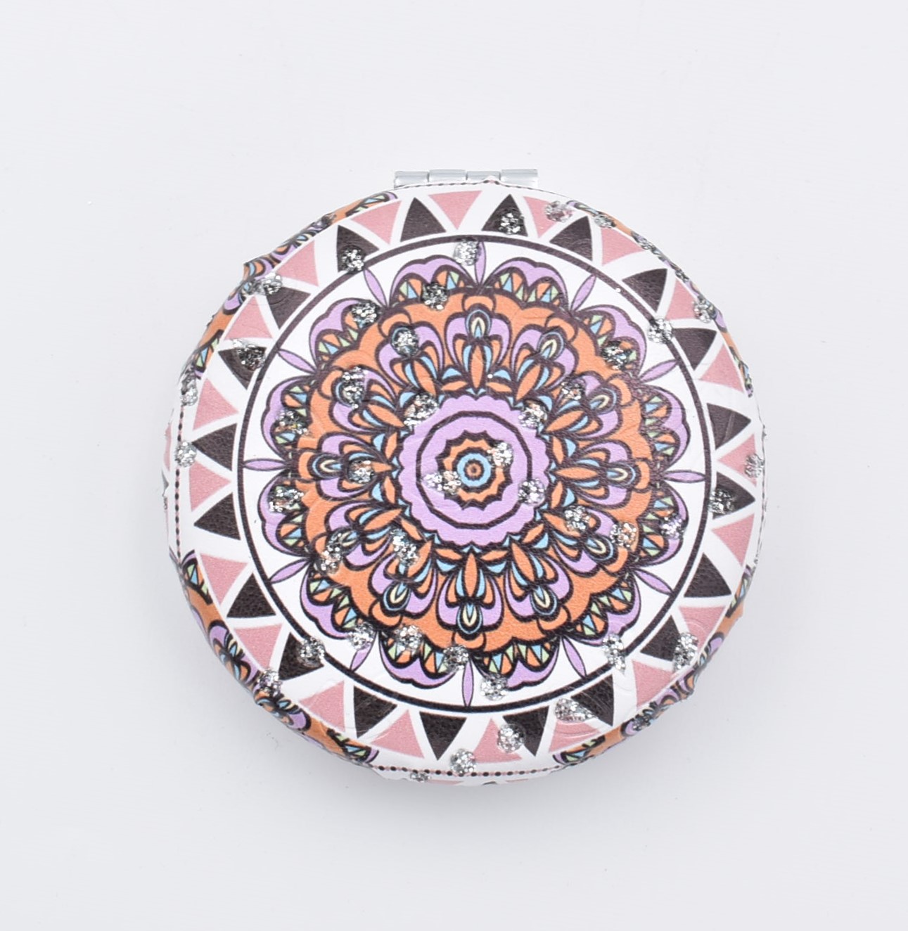 Κομψό στρογγυλό καθρεπτάκι τσέπης με μοντέρνο σχέδιο “μάνταλα” σε διάφορες αποχρώσεις.