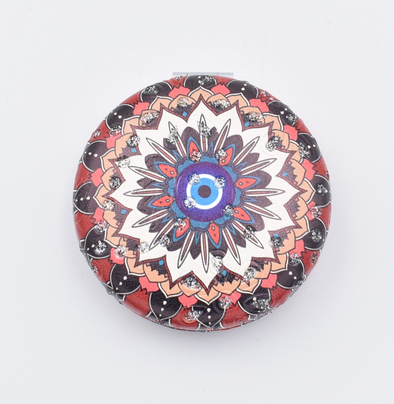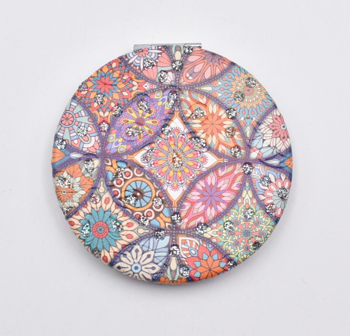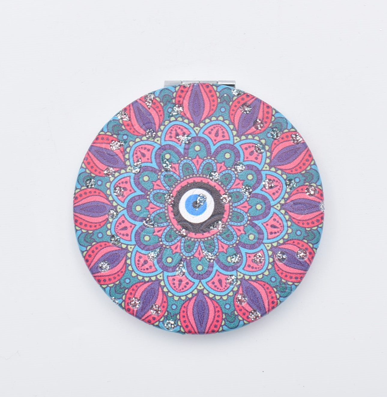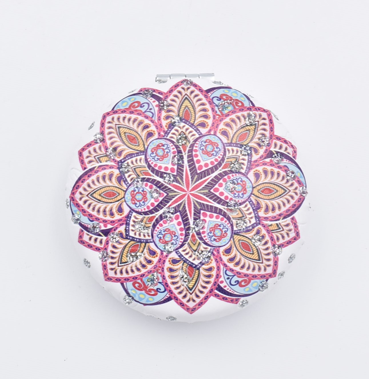 Κομψό στρογγυλό καθρεπτάκι τσέπης με μοντέρνο σχέδιο “μάνταλα” σε διάφορες αποχρώσεις.