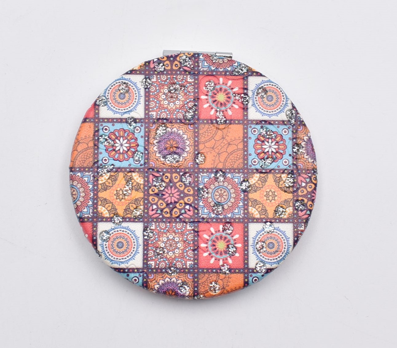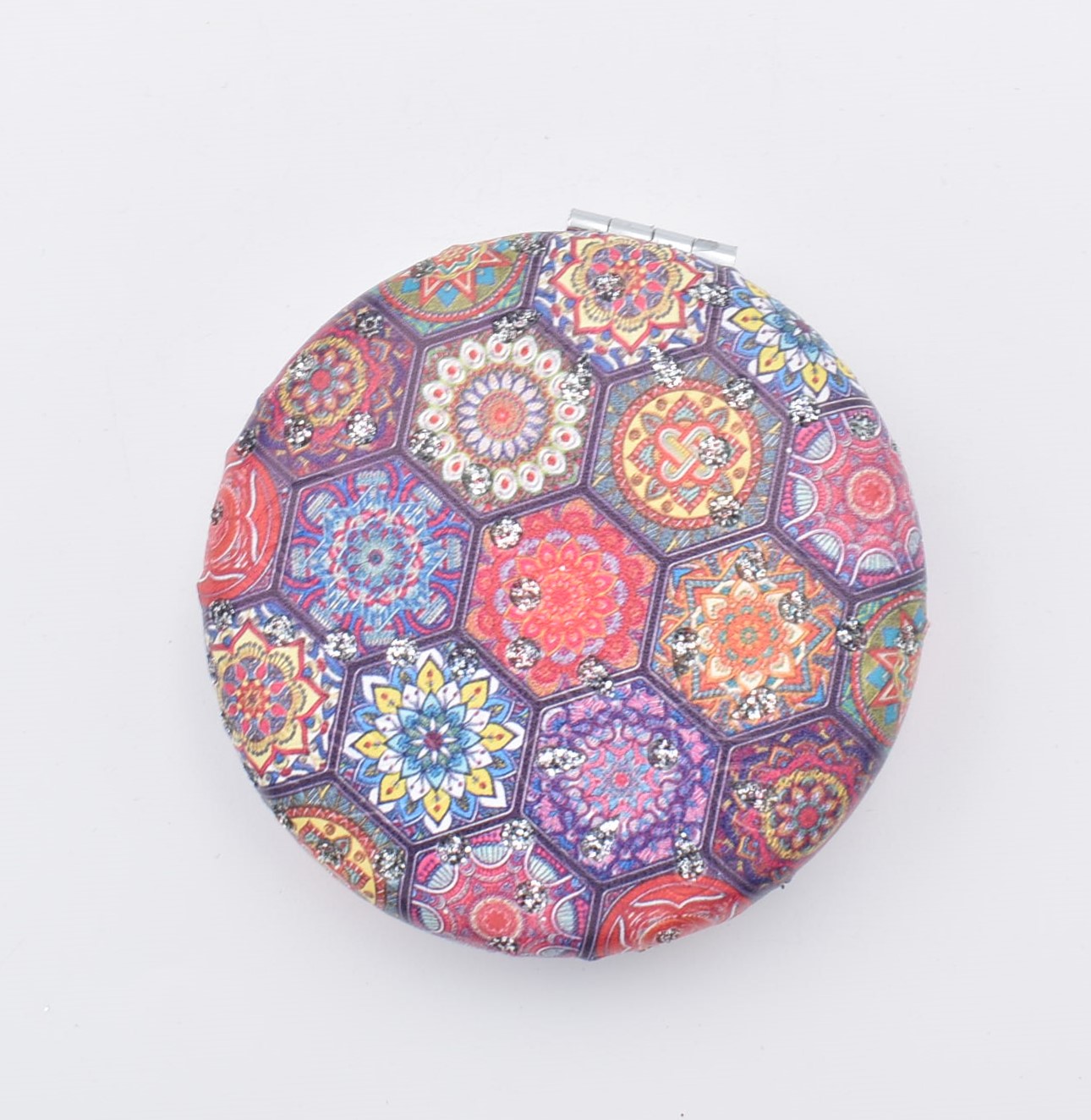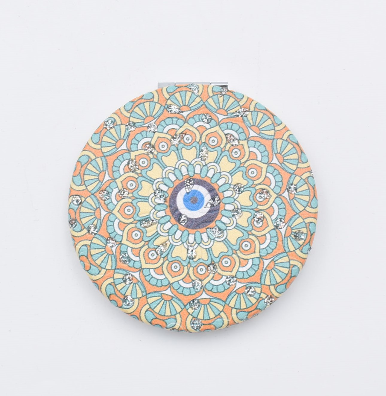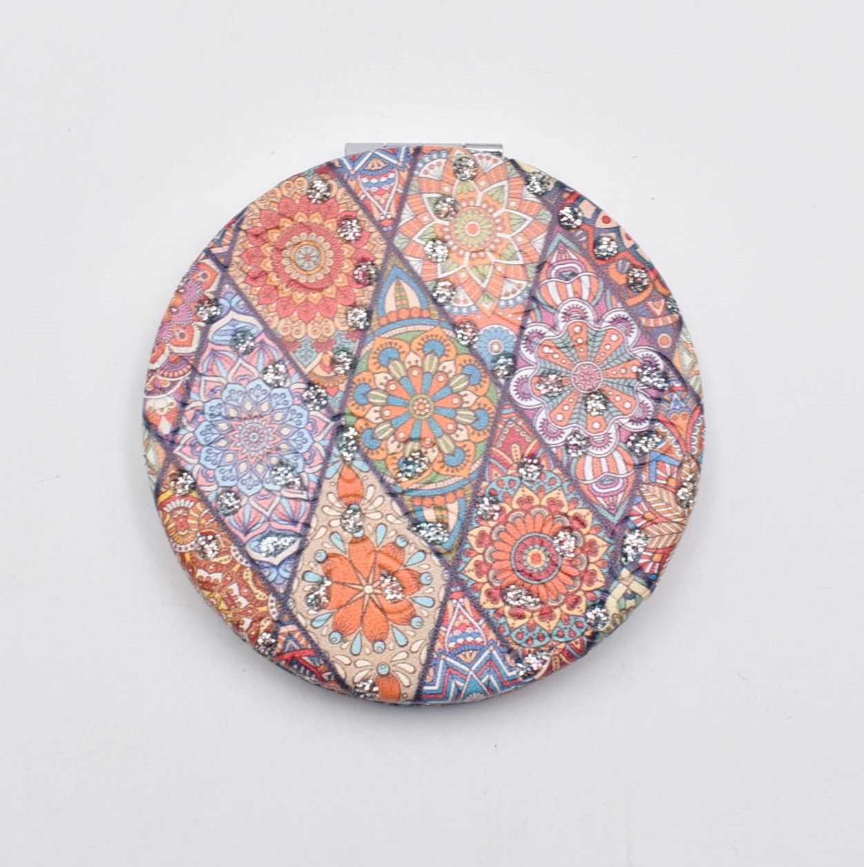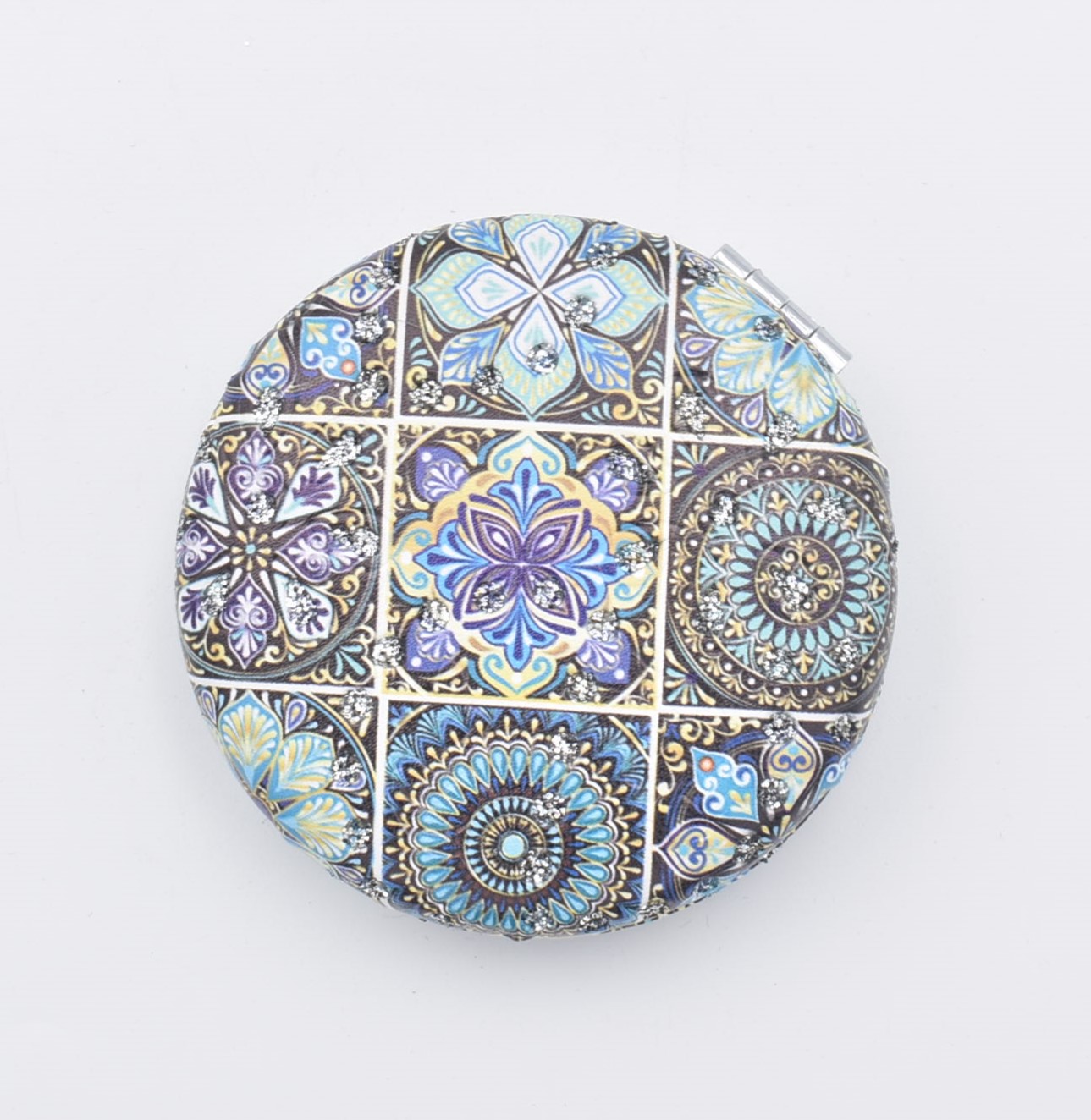 Κομψό στρογγυλό καθρεπτάκι τσέπης με μοντέρνο σχέδιο “μάνταλα” σε διάφορες αποχρώσεις.