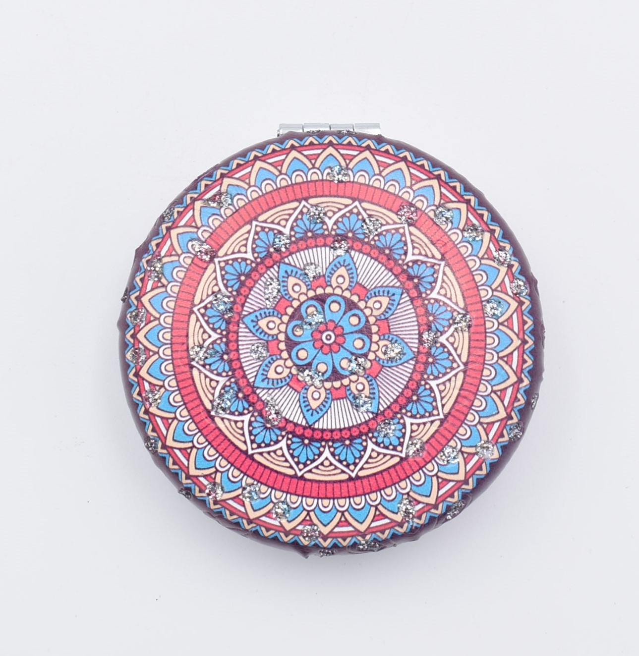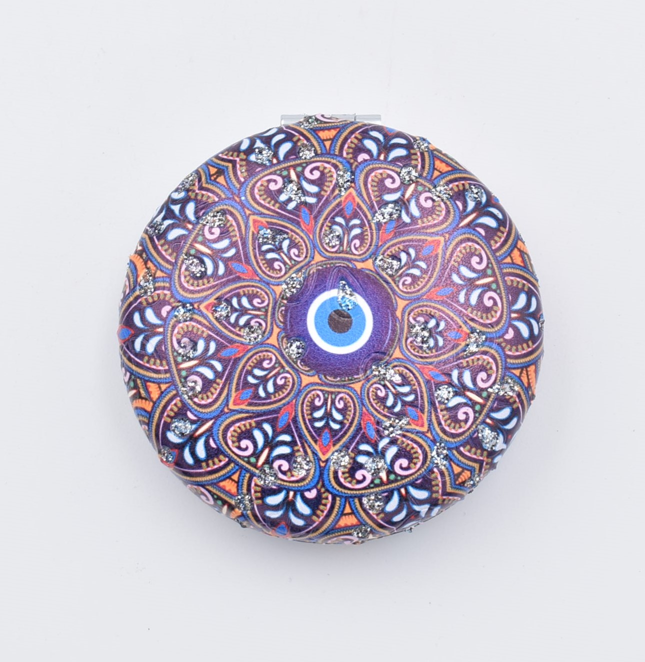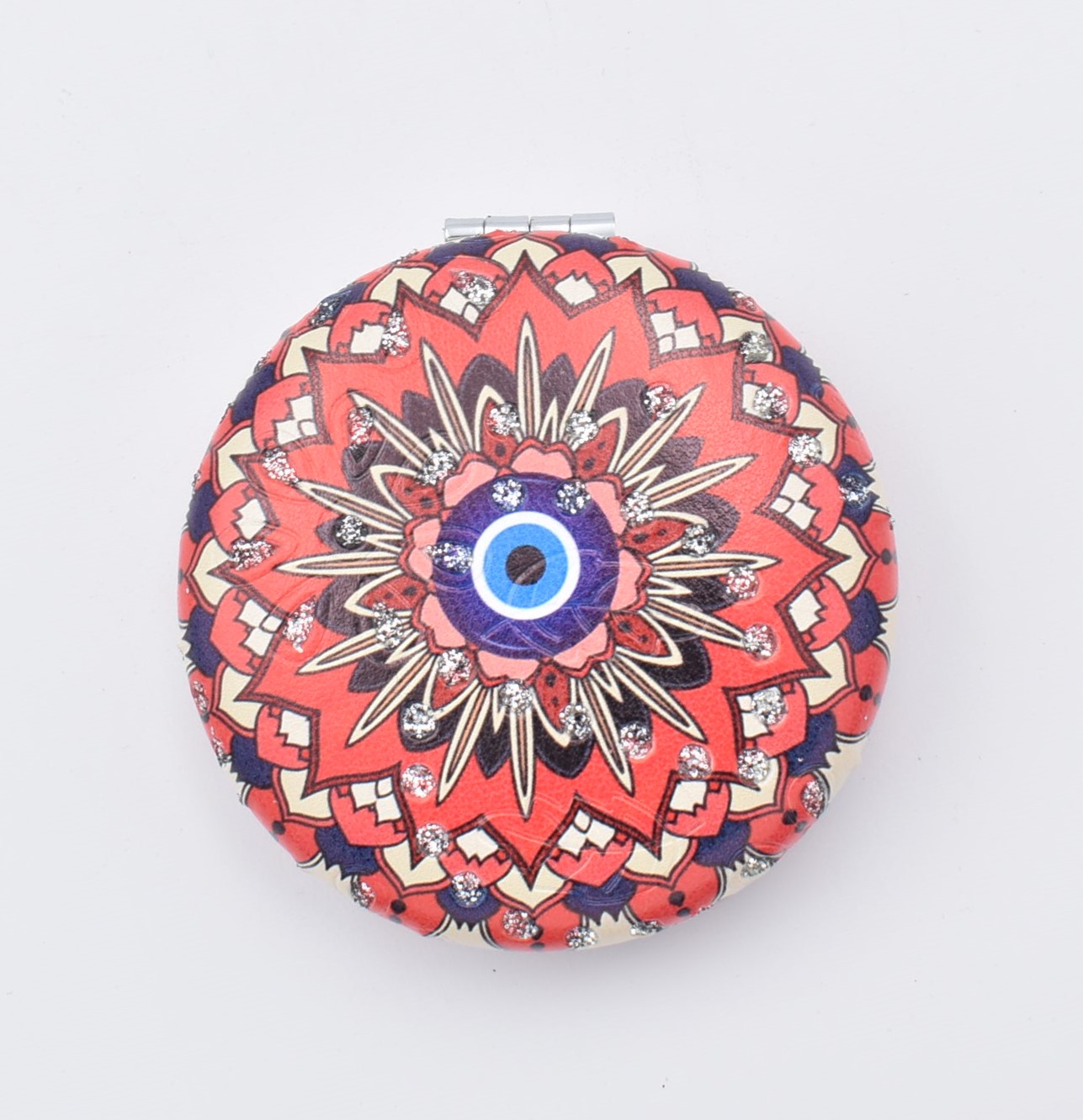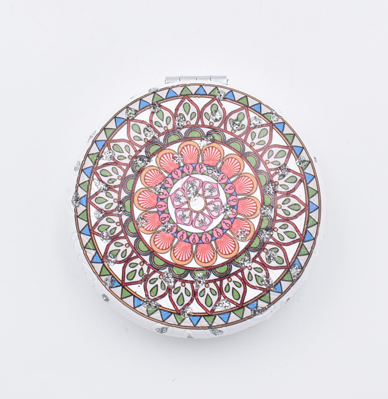 Κομψό στρογγυλό καθρεπτάκι τσέπης με μοντέρνο σχέδιο “μάνταλα” σε διάφορες αποχρώσεις.