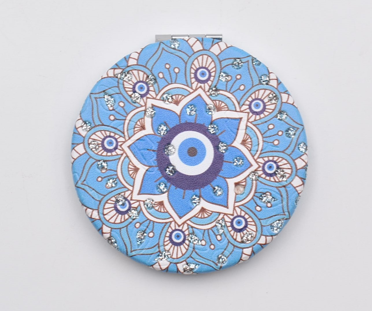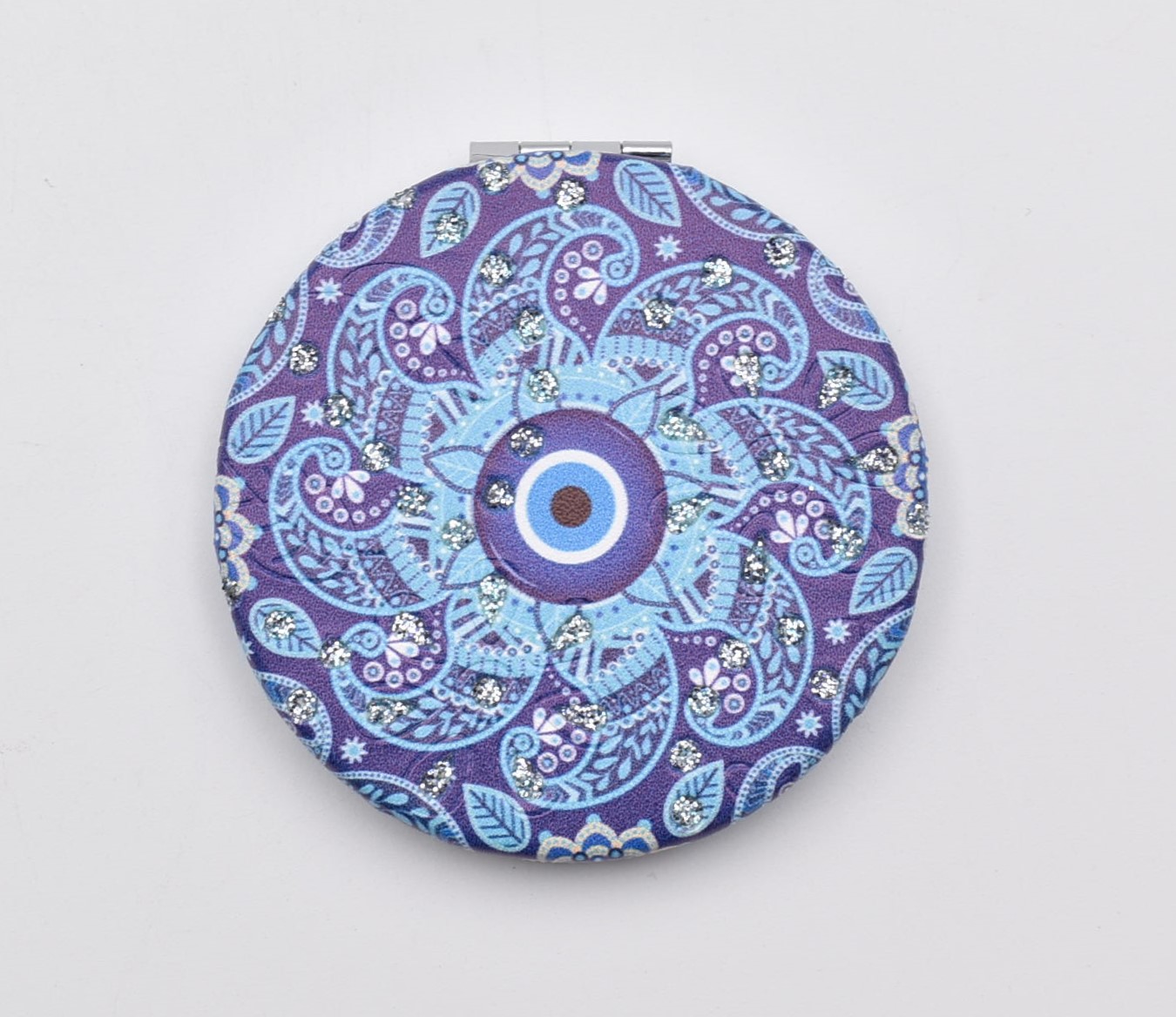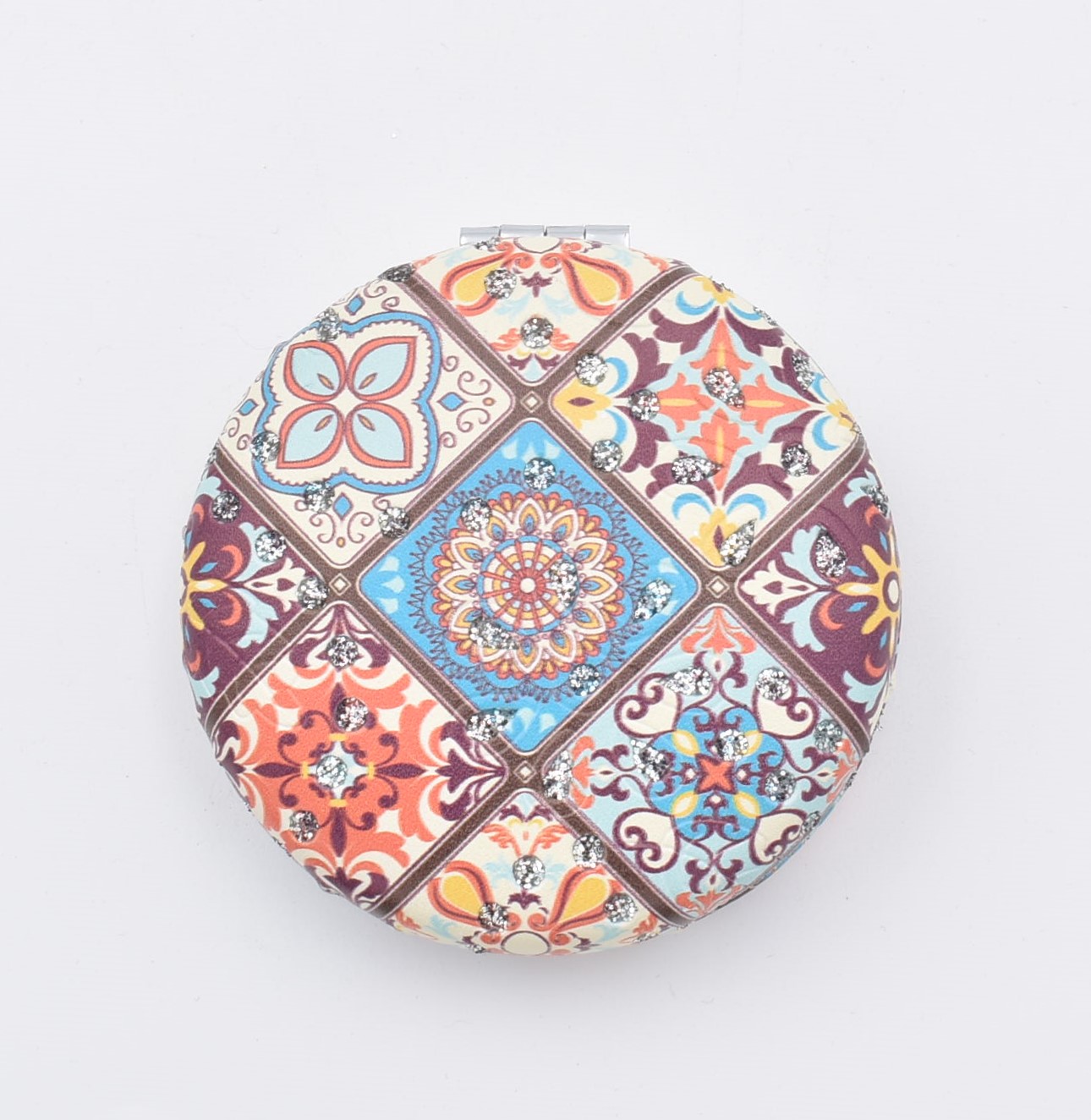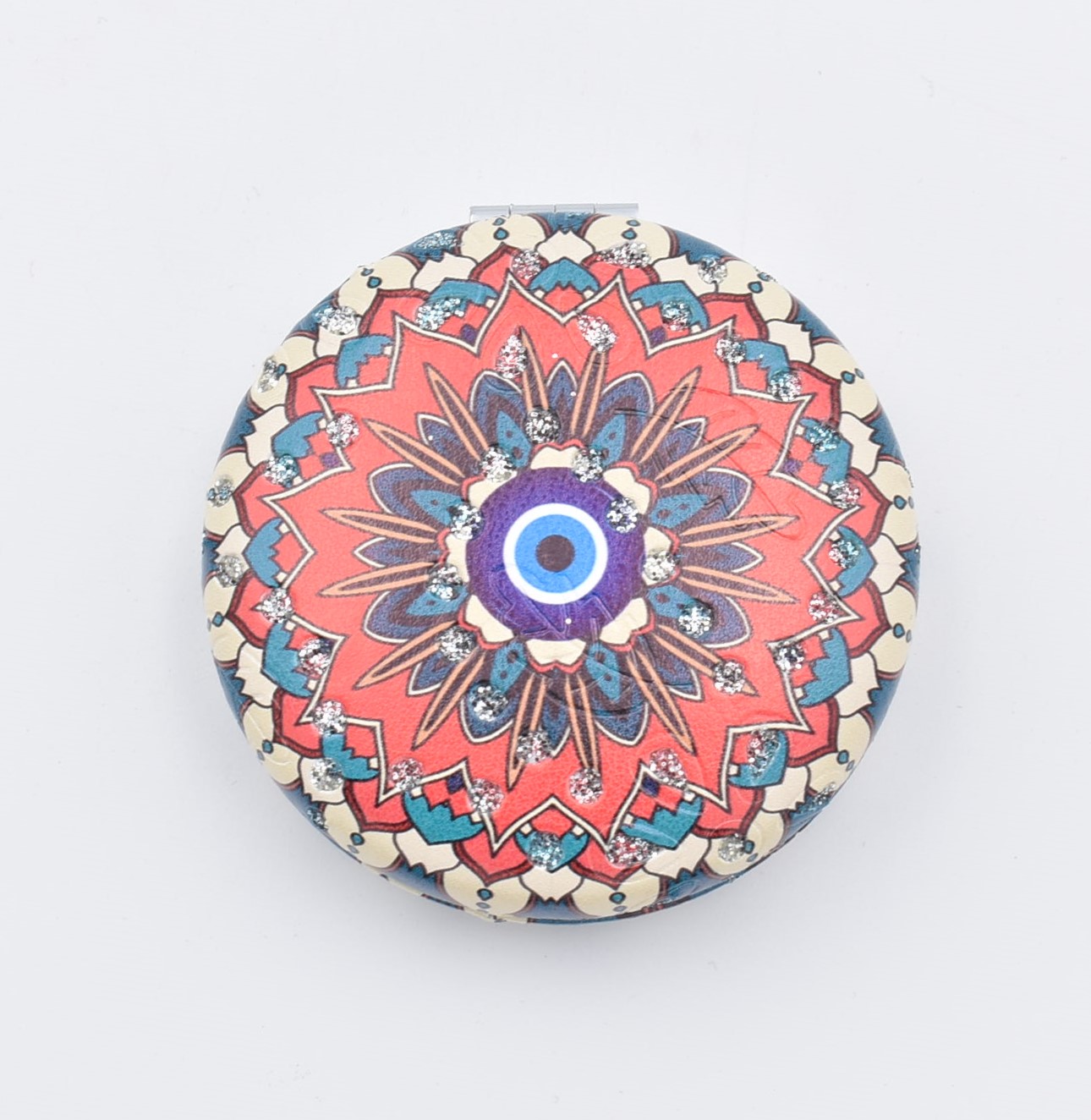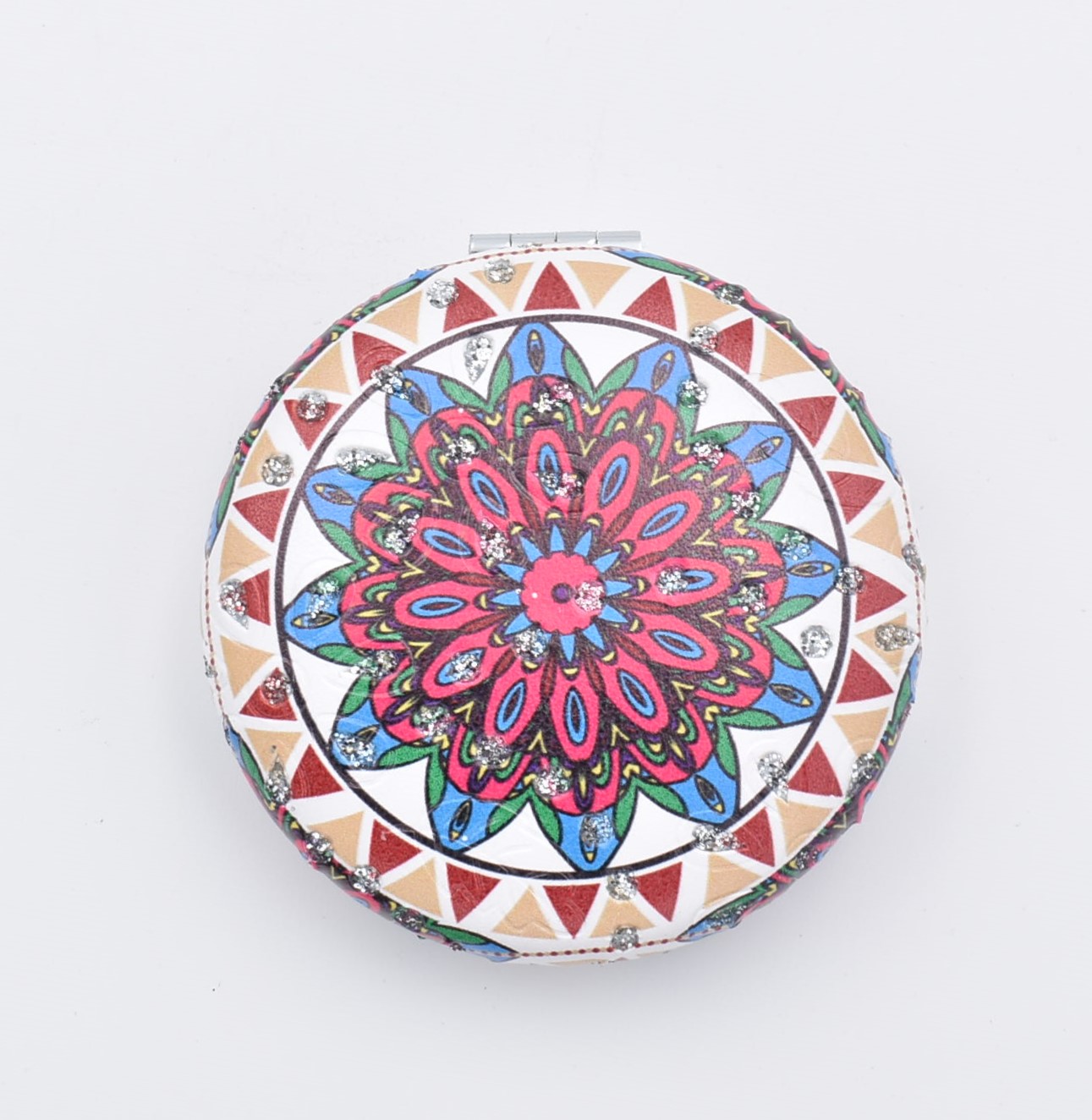 Κομψό στρογγυλό καθρεπτάκι τσέπης με μοντέρνο σχέδιο “μάνταλα” σε διάφορες αποχρώσεις.