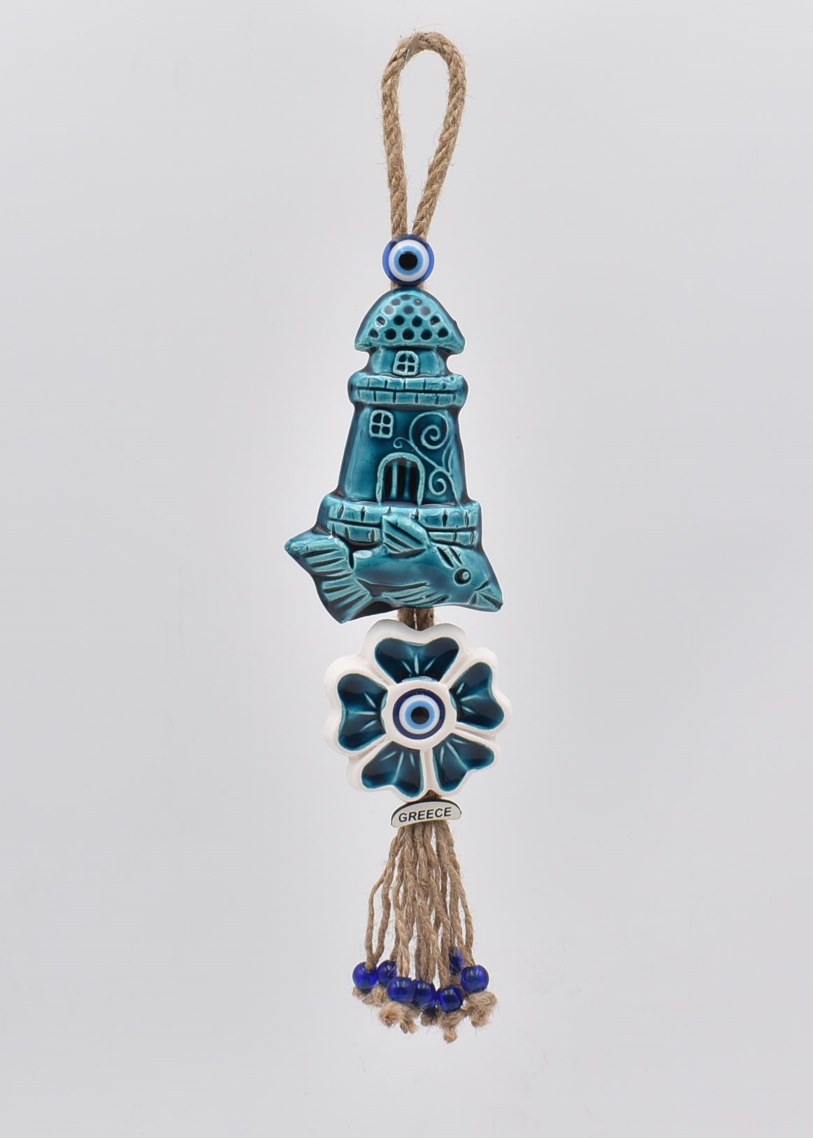 Κρεμαστό διπλό κεραμικό φάρος ψάρι 10 cm  με κεραμικό  λουλούδι