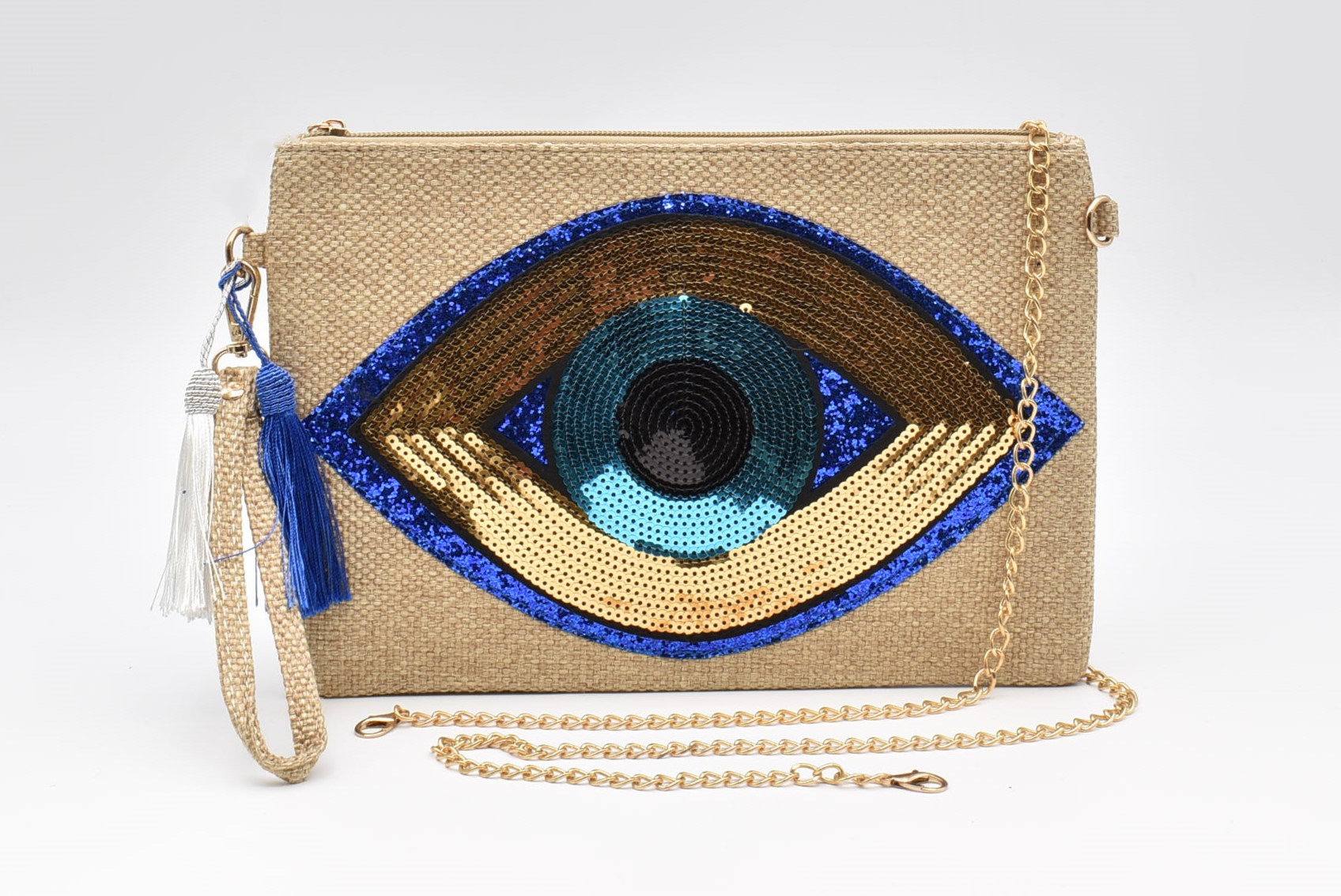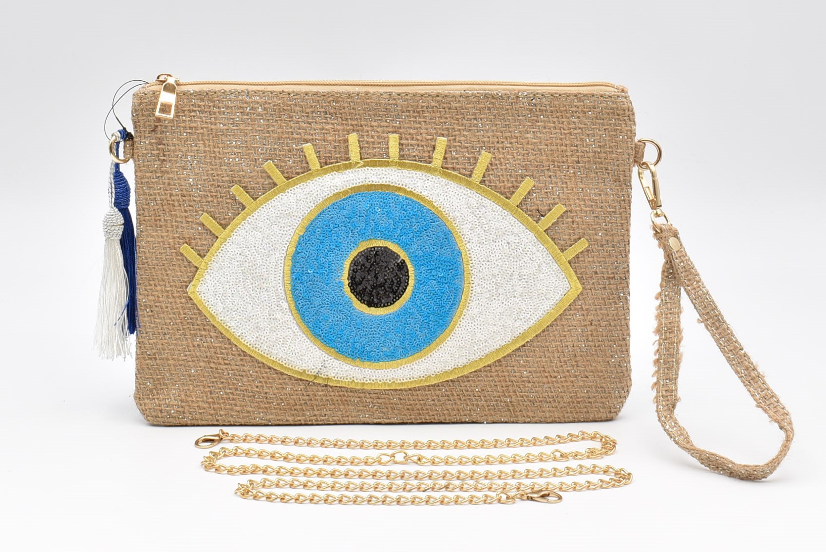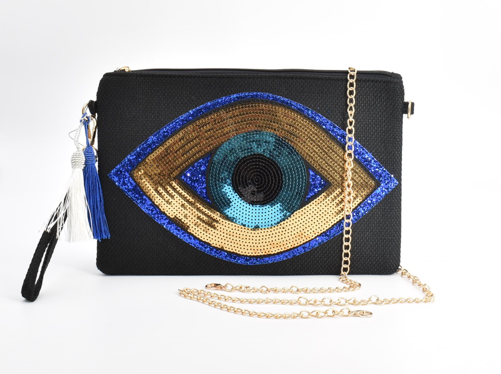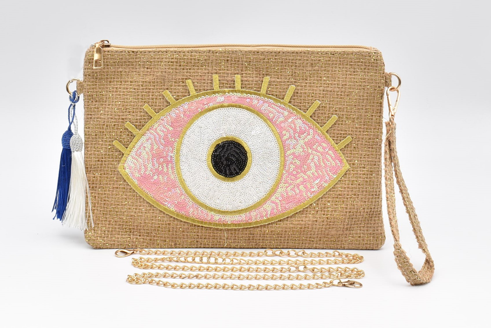 Boho Τσάντα Χειρός – Νεσεσέρ με Σχέδιο Μάτι & Μεταλλική Λάμψη