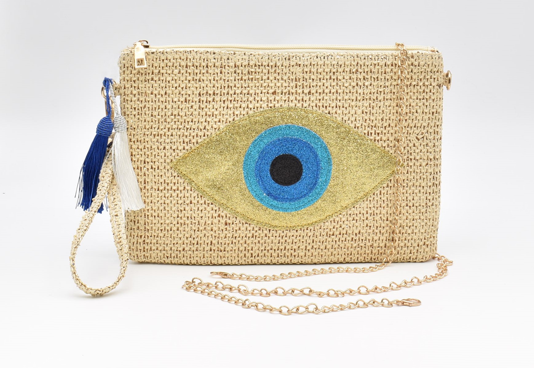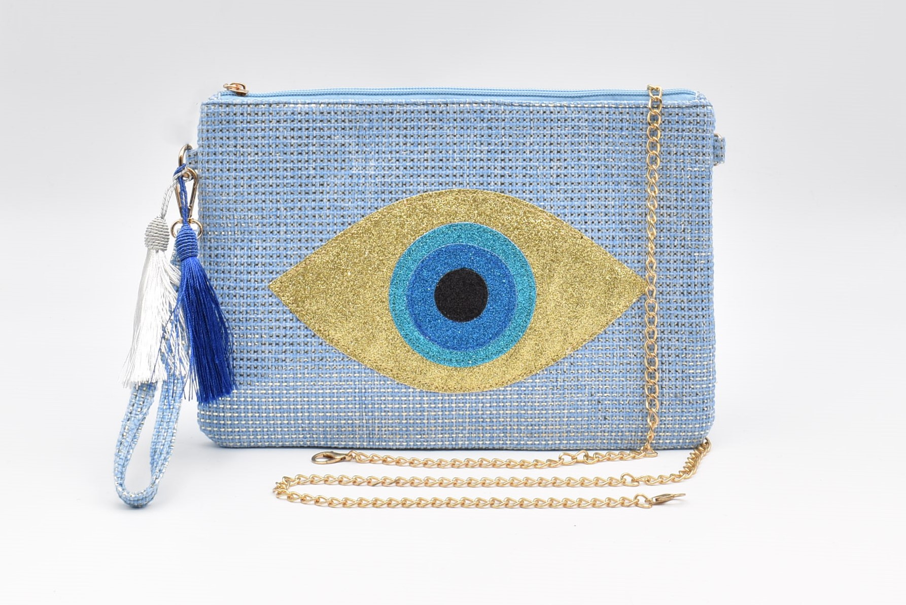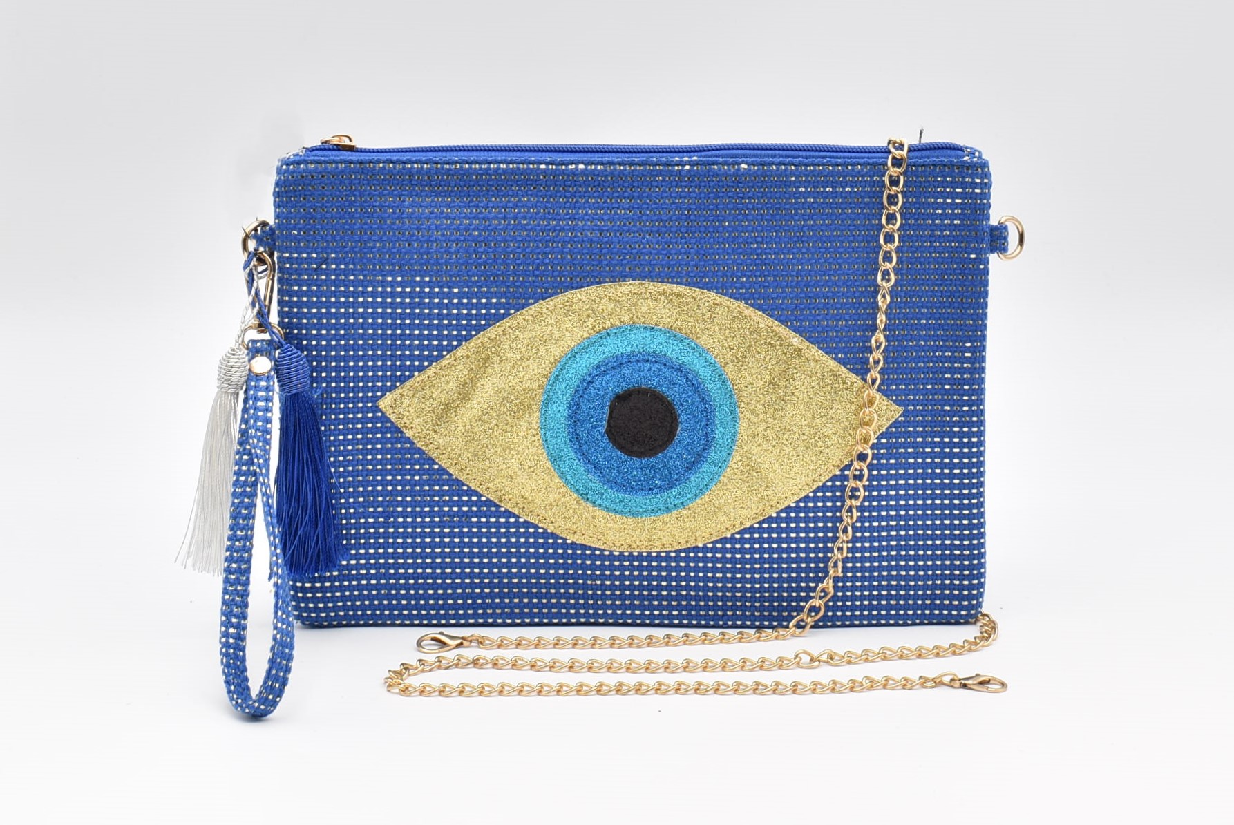 Boho Τσάντα Χειρός – Νεσεσέρ με Σχέδιο Μάτι & Μεταλλική Λάμψη