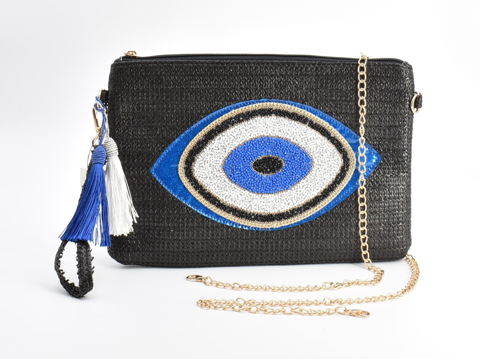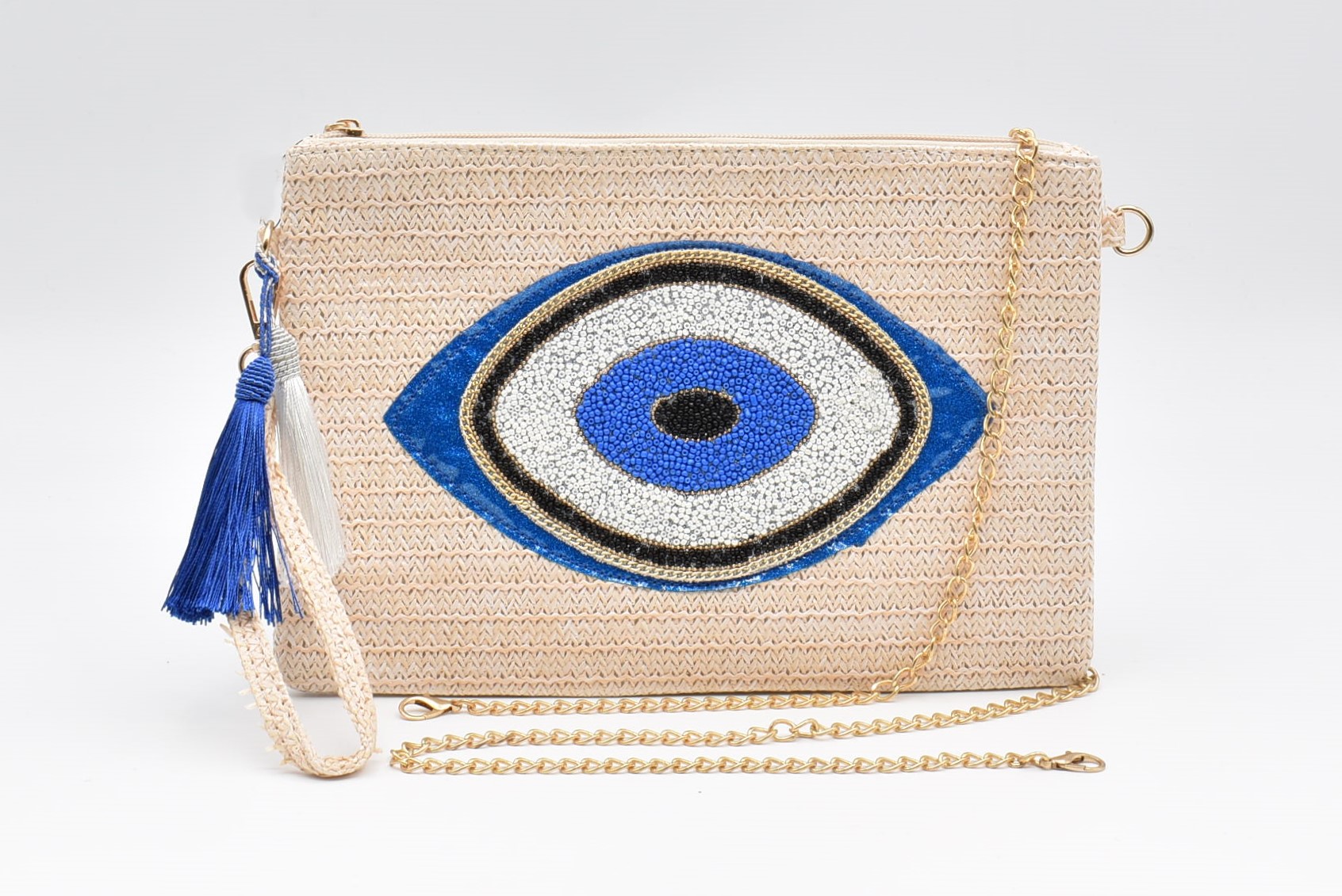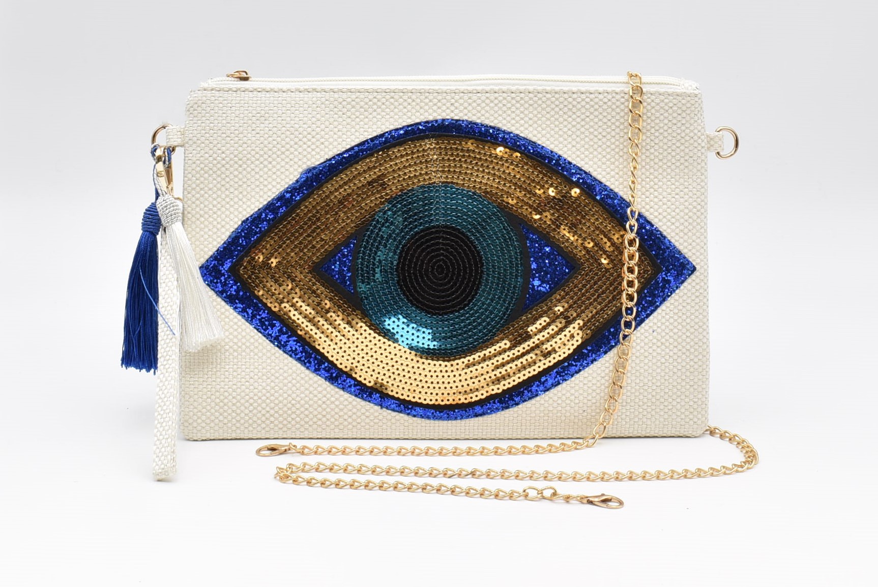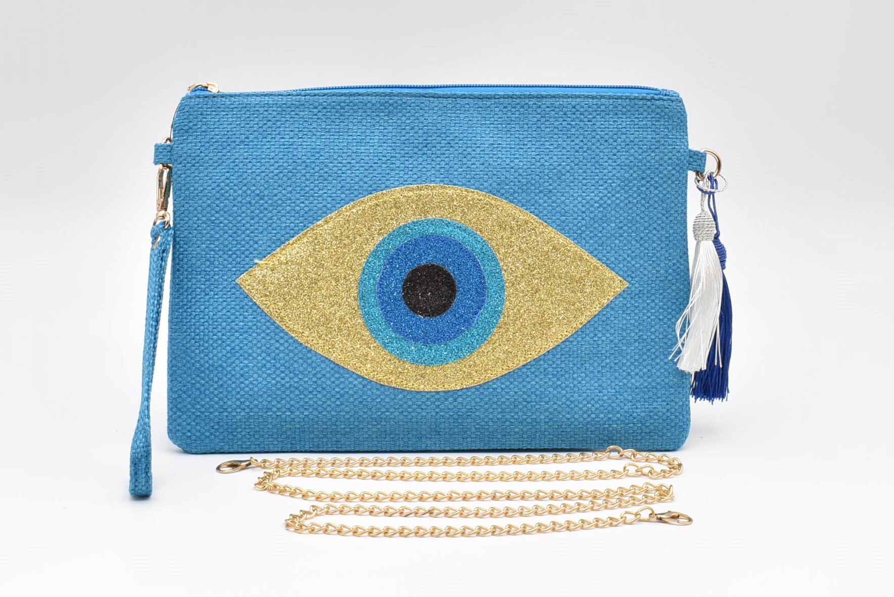 Boho Τσάντα Χειρός – Νεσεσέρ με Σχέδιο Μάτι & Μεταλλική Λάμψη